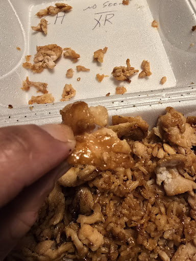 There were several pieces of fat or gristle or whatever in the chicken, there was no spices or seasoning at all, and even the rice was overcooked.