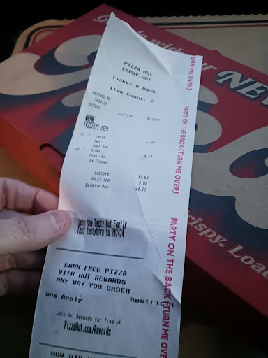 Read moreThe pizza is exactly what you expect from pizza hut (I really like their pizza). We mostly went because their salad bar was open again after being discontinued due to covid regulations. However, the variety on the bar was lackluster, you paid per trip, and just 1 visit was rather expensive for what you got. If it were just that though, I wouldnt have been too put off. The reason for the low rating was the fact that the manager was fussing to/about his employees at a volume clearly audible in the dining area and there was lots of inappropriate language being used for a public business. Both my partner and I were feeling very uncomfortable due to this exchange. I suppose its possible we misunderstood the context but it went on for the majority of the time we were there and I cant imagine it was somehow joking banter. If I were being spoken to like that at work I would be finding new employment. I don't care if admonishment was warranted, people deserve to be treated with respect. Cussing out your employees is not okay. We have a lot of options for pizza in our area, and if we really are craving Pizza Hut we will have to support a different location. I cannot justify going back to this particular one after...