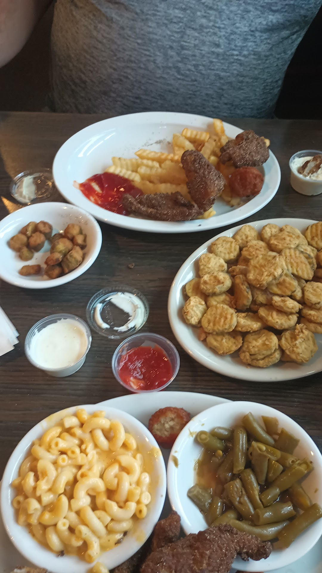 We order the fried pickles and Cajun catfish dinner. No turnip greens, so I ordered the green beans and macaroni and cheese. R got fried okra and fries.