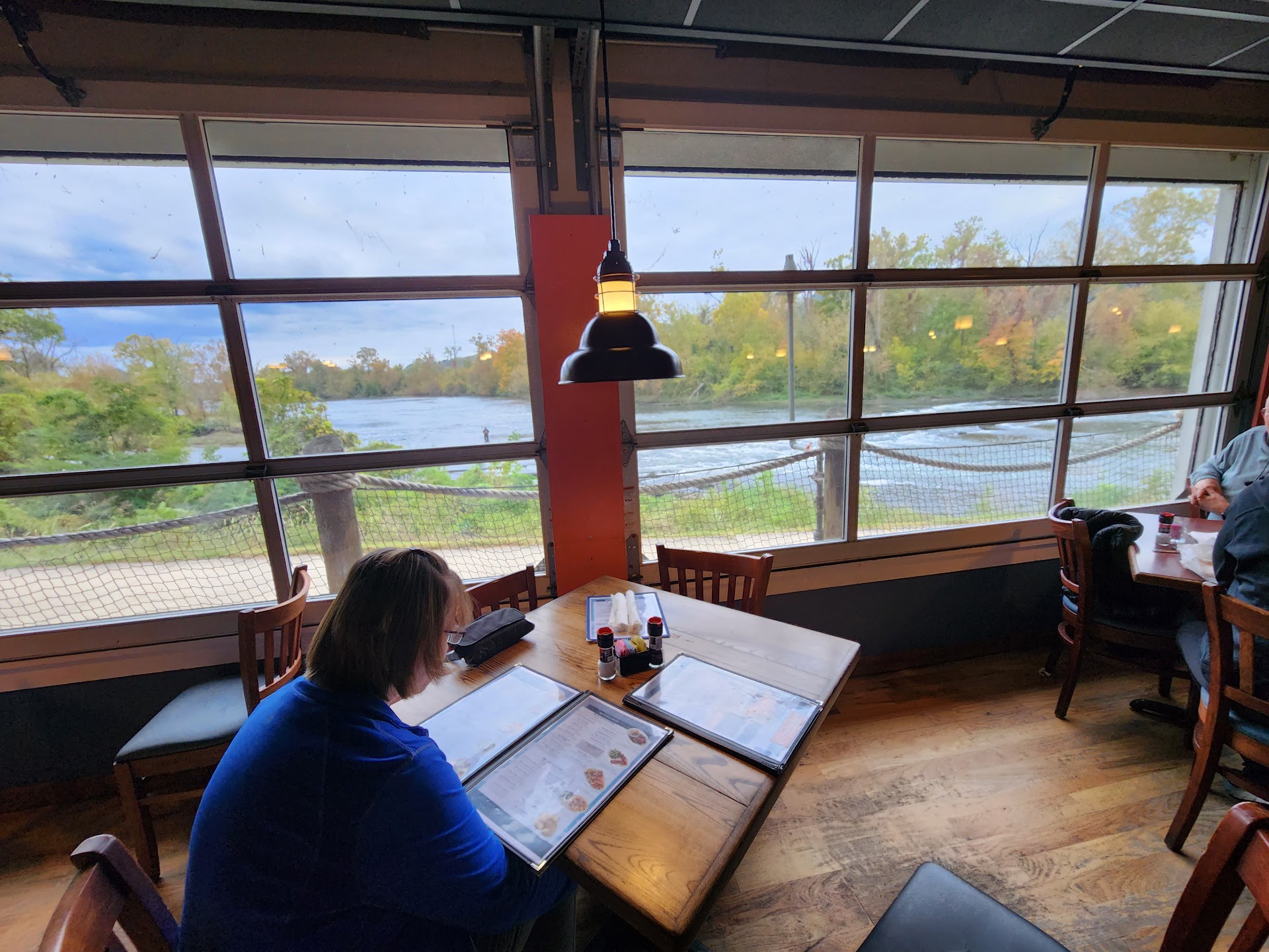 We waited 15 minutes, which was fine, since we were early, and expected to be seated OUTSIDE. Instead, they seated us INSIDE on the inside of the back deck with the big windows that overlook the river. To add insult to injury, they stuck us at the far end of this deck next to the only CLOSED WINDOW on that back deck and it was roasting hot in that spot. I could feel my anxiety rising and my face was getting flushed after just a couple of minutes. When our waitress came and took our drinks I told her this seat was not satisfactory, that it was too hot. She was very understanding and accommodating and moved us to another table in another server's section. Yes, it was a bit cooler but it was still not OUTSIDE. My husband seemed ok with our new location so I didn't pitch a fuss like I really wanted to so I kept quiet and my temperature and anxiety eventually subsided. At least it was a little cooler as we were across the aisle from an open window that was still overlooking the river and a very slight breeze was coming in.