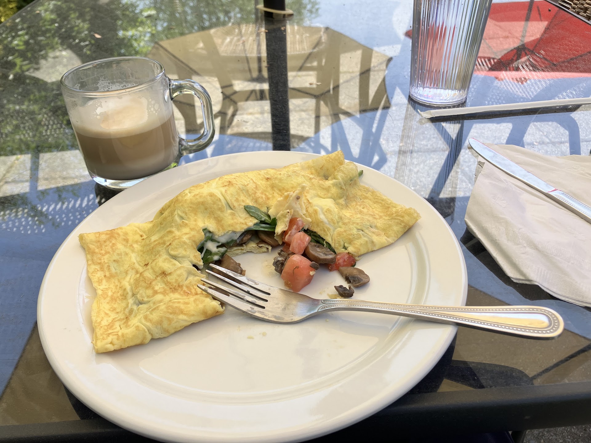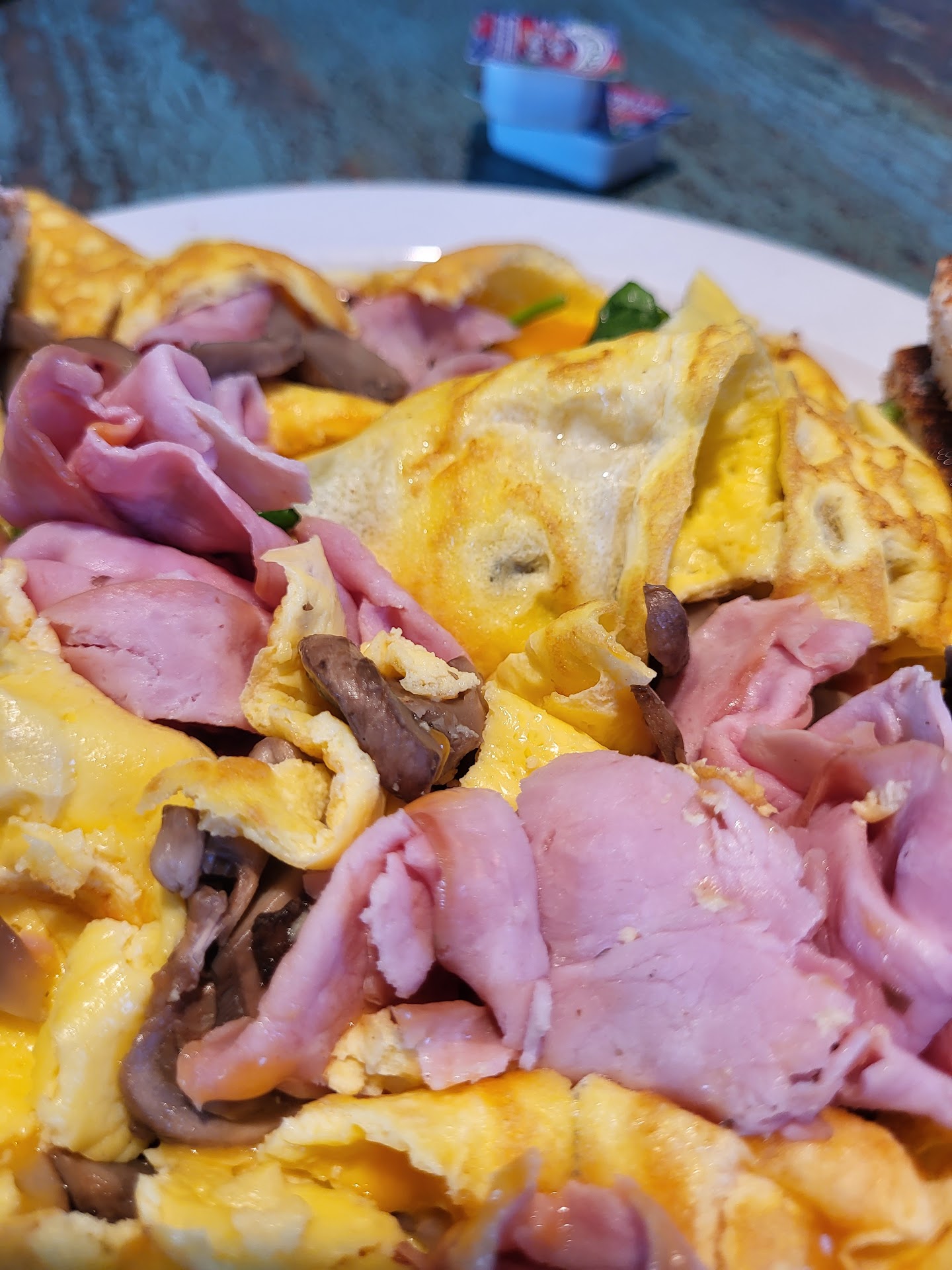 We arrived on a Saturday morning around 10, and decided to sit upstairs since the outdoor seating wasn't available. The dining area on the upper floor was half-filled with patrons, so there was plenty of tables available. I had a meat lovers omelette that was stuffed with bacon, ham and sausage. The eggs were not of the bagged variety that you would encounter at an average greasy spoon, but made from fresh eggs. The sourdough toast was buttered throughout, not just a pad that was haphazardly spread.