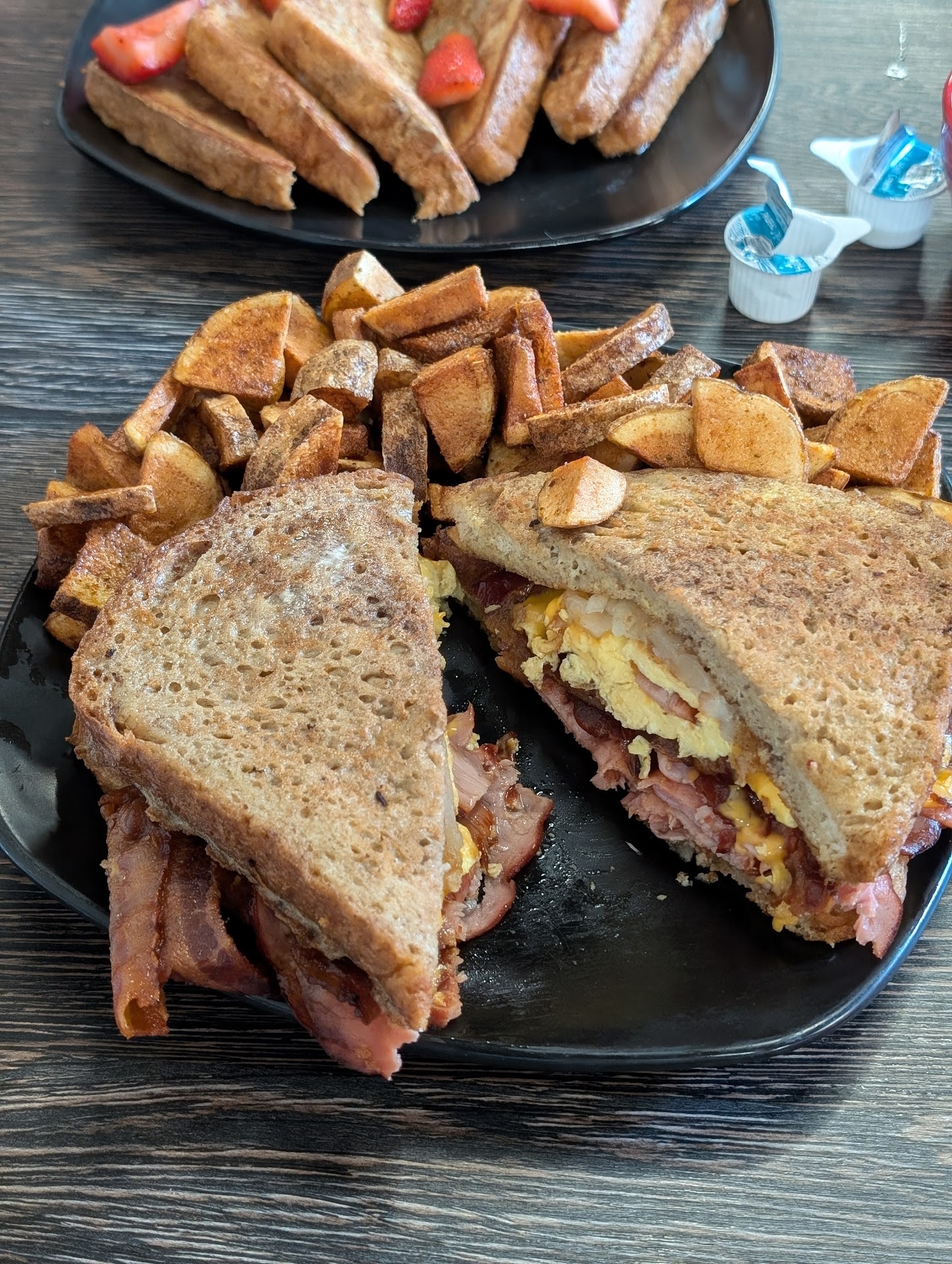 I then chose the French Toast Melt, consisting of battered and grilled brioche bread, ham, bacon, scrambled eggs, cheddar cheese, and hash browns. Butter and syrup were baked in the batter, and although powdered sugar was supposed to be included, it wasn't present (unless that was in the batter as well). The sandwich was served with a side of breakfast potatoes.
