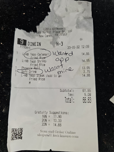 Read moreThis was a negative overall experience for our family. We ordered several appetizers, a couple of sushi rolls, and several entrees. The food was solidly mediocre. The vegetable spring rolls were frozen food quality. Plain mushy filling. The Katsu chicken came out dry. The onion soup had the flavor of powdered beef broth with store bought pre fried onion bits and some mushroom shavings in it. The salad was a single shining star on the full table of general disappointment. Fresh lettuce, sweet and tangy dressing. My only complaint is its entirely ice berg lettuce In a bowl. The yakisoba noodles were unseasoned dry fried noodles with chicken on the side. My son ended up dipping it into the onion soup so it would have at least a little flavor. The tepanyaki steak was tough and lacking seasoning. The fried rice was dry and did not taste fresh. The tepanyaki chicken was tender buy was also plain. The mediocre food was reason enough for us not to recommend this place to anyone. We were given further reason when we were handed the check with a mandatory tip of 18%. We were told it was due to our party being five or more people. We have never agreed with a mandatory tipping scheme. It encourages poor service. We always tip higher than 18% when the service is excellent. This service was not bad but far from above average. If you find yourself in the mood for Asian food, in this reviewer's opinion, avoid Shogun. For great hibachi, try Asian city in Humble. For good ramen in a casual environment, try Airi poke and ramen in the same shopping complex. I dislike giving any eating establishment a bad review. In general I will simply not post a review for places we don't enjoy. Shogun at Valley Ranch...