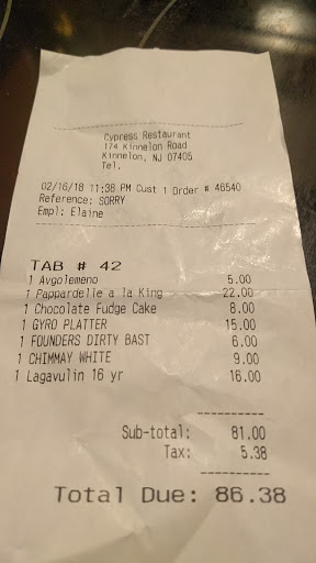 Read moreI went to Cypress with my wife and another couple. I ordered the swordfish entree, and my wife ordered a shrimp kabob special. She asked if she could substitute the chili hummus for something else, and the waitress suggested potatoes. When our food arrived, my wife was surprised there were only four small shrimp total and the rest vegetables (it looked like at appetizer). But the real problem was the swordfish it was the tail end piece. The thickest was less than a quarter inch, it was EXTREMELY DRY and FISHY. I called the waitress over and told her the rice is the best I ever had but i could not eat the fish it was like cardboard. She said she would go talk to the cook. I sat there and watched everyone eat their meal and wondered what was happening with my meal. To my surprise, the waitress later came over and asked if we wanted dessert. I didn't even have dinner yet. My wife ordered dessert. The waitress asked if I wanted dessert and I told her I couldn't have dessert. She then brought two extra desserts and said they were for everyone at the table and they were on the house because of my dinner. I just wanted dinner and couldn't believe it. I didn't say anything. My wife ate her dessert, but the other two desserts weren't touched. When the bill arrived, they charged an extra six dollars for the substitute potatoes, and i was charged for the swordfish dinner that I was still waiting for. They only changed for the one desert, not the two that we neither ordered or ate. I told her that I wasn't paying for my dinner and now for the potatoes either. She said she would talk to the management. The management came over and said they would remove the potatoes. I said the main point was the bad dinner that I never ate. She then sent over the owner. He was very rude and asked what the problem was. I explained how inedible the fish was. He angrily left and then came back with the fish and potatoes removed and then said he wouldn't take any coupons. I said it was the other couples cash certificate, not a coupon, and they had nothing to do with our issues. He said he would call the police, the other couple said NO I will call the police and pulled his phone out, the owner said forget it he grabbed our cash and certificate on table and i believe said, hope you don't come back. OMG this was the second time I ever sent back a meal, I always tell people not to do so unless absolutely necessary i couldn't believe...