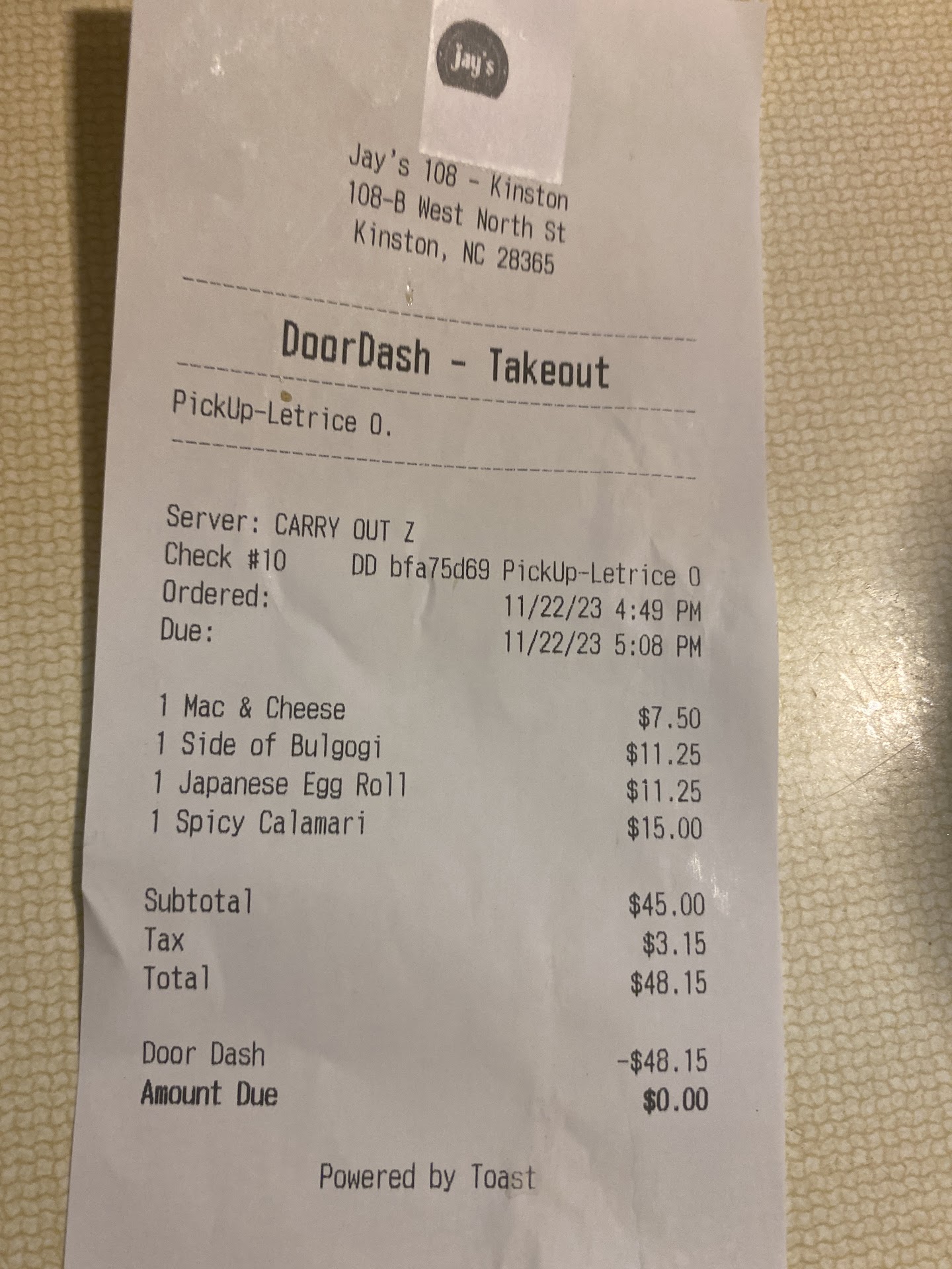 This will probably be my last take out order! After, this last mediocre experience. We been eating here quite regular for 2yrs. This time the food was just basic. The bulgogi was dry, the meat was shavings, very FEW whole pieces. The brown rice was NASTY-it was sticky but still crunchy(under cooked)! I've had better brown "minute rice." I ordered the Snow White & Goldsboro roll. Both looked like they had been made earlier in the day; they fell apart when picked up with my chop sticks!! I couldn't even dip it in my soy sauce!!😡 The chicken bowl was good as usual, but they FORGOT MY YUM YUM SAUCE!! We spent $107, to be disappointed! Not too mention the new Toast online ordering system was a PITA!! THE ADDED FEATURE IS A "TIP OPTION!" We TIP great when we dine in, but for someone to bag my food...COME 'ON! My cold salad was placed on top of my hot rice bowls. The Mac n Chz was HOT & PLACED ON TOP OF MY SUSHI!! So, clearly she didn't care how it was bagged & left out my Son's favorite, the white sauce!! So, no I don't TIP online, maybe when I pick it up if everything is right and they are nice!! Too much pressure to tip for doing their job, when that's not even done correctly!! Do BETTER folks! Also, we eat at the lil small stores Jay owns in Mt. Olive & Greenville!! So, we know how it should be done & how it is supposed to taste!! Mac & Chz was very good; the noodles could've had a pinch of salt in the boiling water. Then, it would've...