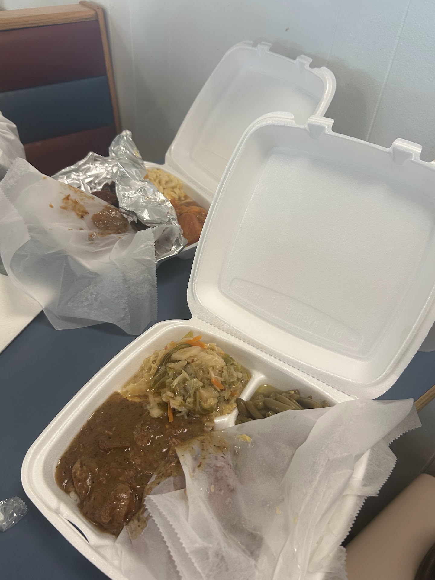 I ordered the beef tips and rice with cabbage and green beans, paired with an Arnold Palmer. He went for the pork ribs with mac and cheese and potato salad, plus a sweet tea. We tried to get the peach cobbler for dessert, but unfortunately, they were out.