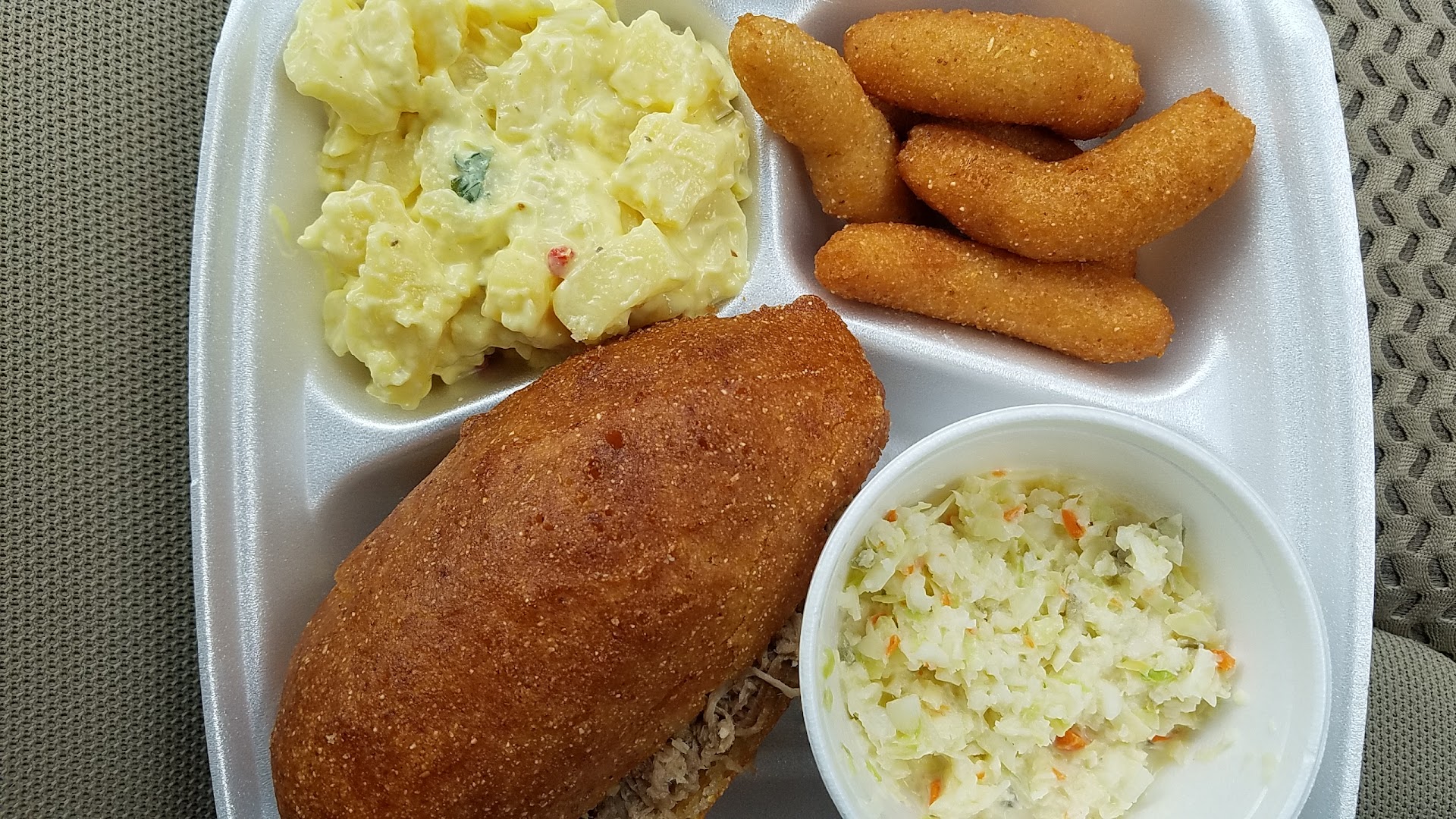 Amused that the slaw was diced, the h.puppies were white corn, and the pork wasn't sauced... all part of the experience, and not in a bad way, at all. I enjoy trying different local specialties.