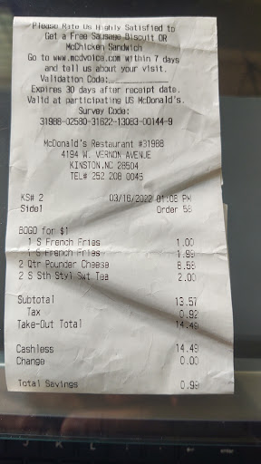 Read moreWhen I think of McDonald's I usually think of the fries. Hot, crisp, slightly salty and just plain good. The Quarter Pounder is my second thought and is usually, well, not bad. Not having been to McDonalds in quite a while, we decided to grab a quick lunch while passing through Kinston. We arrived just after 1:00 PM and ordered two quarter pounders with cheese, two small fries and two drinks. Not realizing prices had increased I was surprised to pay $14.49. The sandwiches were a bit dry possibly from the over cooked beef patties or maybe they had been sitting a while and they were not the acceptable serving temperature. Large chunks of raw onion as opposed to the small diced I'm used to were in abundance. I don't believe the fries were ever crisp and they were definitely not hot and not seasoned properly. The sweet tea was acceptable. So that's what you get in a McDonalds for just south of $15.00 It's interesting to note that according to the receipt if you rate them highly satisfied you'll receive some free food. That may tell you that the rating they reference may be inflated just a bit. I'm sticking with my rating here on Google Maps. McDonald's can keep...