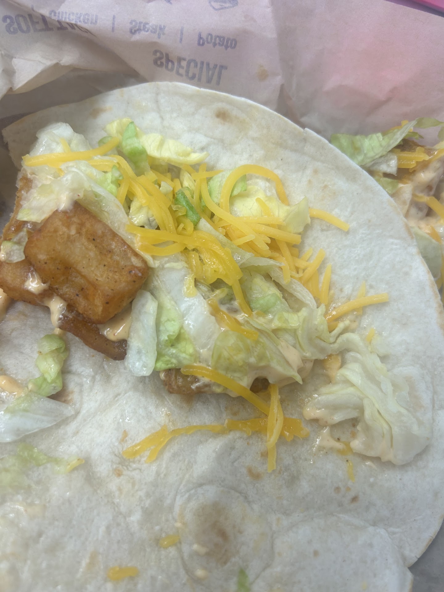 The 2 soft chicken tacos I ordered had the same horrid lettuce and were thrown together, and as soon as the wrapper was opened, they fell out everywhere... Was beef hot chicken.