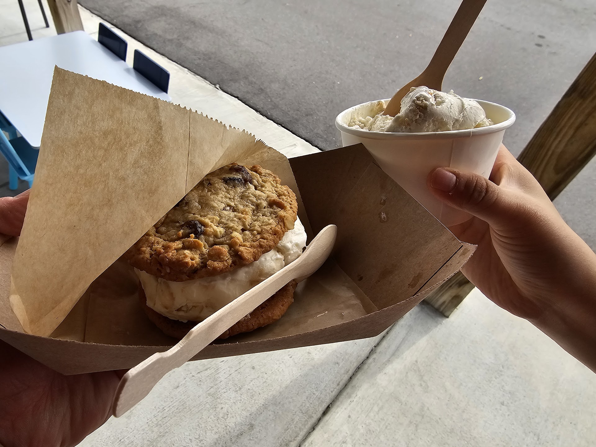 At first I liked this place and thought the atmosphere was nice. I initially went when they first opened up. The lady was nice and did great with our orders. We like to support small local business’. Recently we went 3 different day and times. Getting ice cream is no big deal, love the new color changing spoons. The cookies however, seems to be an issue. First time, everything went great, got my ice cream and 2 cookies. Fell in love with the cookies. Second time, I went back cause I was really craving the cookies, tried to order a dozen, the girl looked at me confused and asked her co worker if they even have that many (why have it listed if you don’t?), the girl responded it would take 30mins. I was fine with that and was good to wait, not even 5 mins later after I said okay, that’s fine. She then changes up the answer to it now being 30mins to 1hr wait with a face where you can tell they just did not want to make them. It wasn’t even busy either so I don’t know why it was so difficult. Like why advertize a dozen cookies then get McDonalds treatment where they say the ice cream machine is broken when in reality they just don’t want to clean the machine. Maybe remove the advertisment and put 2 cookies max. Ended up leaving and going elsewhere for cookies. Third time around, I wanted to give this place another try and get some of the cookies and ice cream, I just ordered 2 since ordering a dozen seems to be an issue. Ice cream was great, cookies were hard as a rock and not enjoyable. Did not appreciate getting old stale cookies. I’ve given up and will not...