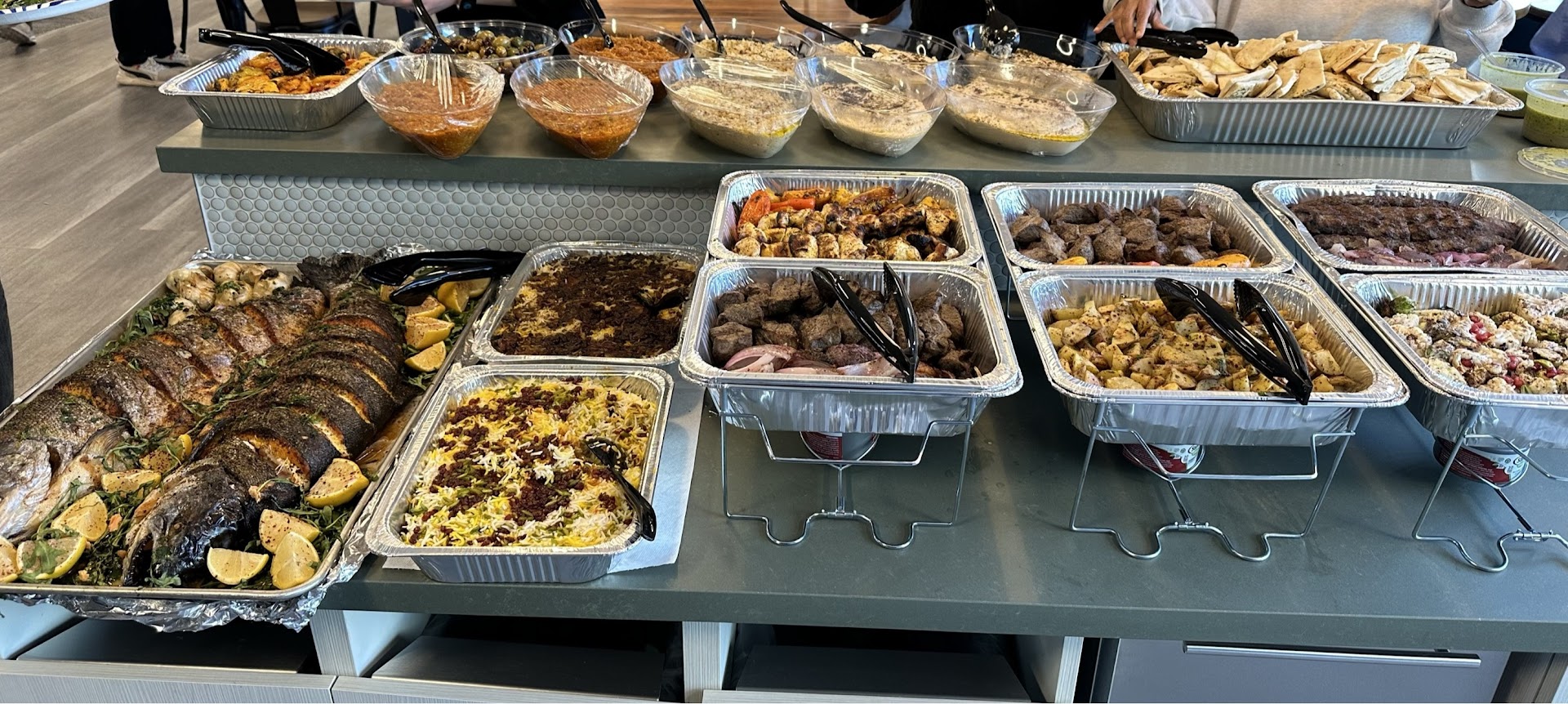 The food was not only delicious with fantastic presentation, but it was extremely well packaged as well! Bibi's had a team member help me with preparing the food in the trays, serving the food, and even helped with the cleanup. I had several people come up to me asking where the catering was from and many people went back for a second plate. We had a mix of beef, chicken, 2 whole salmon, kebabs, 2 types of rice, pita bread, 3 types of hummus, 2 types of salad, grilled vegetables, grilled peppers, and olives. I might have missed an item or two - but we definitely did not run out of food - many of our employees were happy to take some leftovers home!