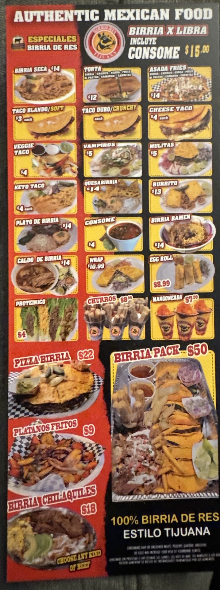 Read moreThis is it. We finally stopped by and it was the best decision of the week! The birria meat is delicious across all dishes, soft with just enough bite for texture, flavorful with just a hint of smokiness. Spiced but not hot-spicy for the local crowd, thankfully they served some grilled seranos alongside our tacos that ramped up the heat. Green salsa was my fave, but the red had some good heat. We ordered waaay too much for 2 people: 3 cheese tacos, birria fries (absolutely covered in meat), and a birria torta. The torta was nearly the size of a dinner plate and was excellent as leftovers for lunch x2 (tip: remove lettuce+tomato, wrap in foil, put in 350 oven for about 30min, add back cold stuff and enjoy). We'll absolutely be...