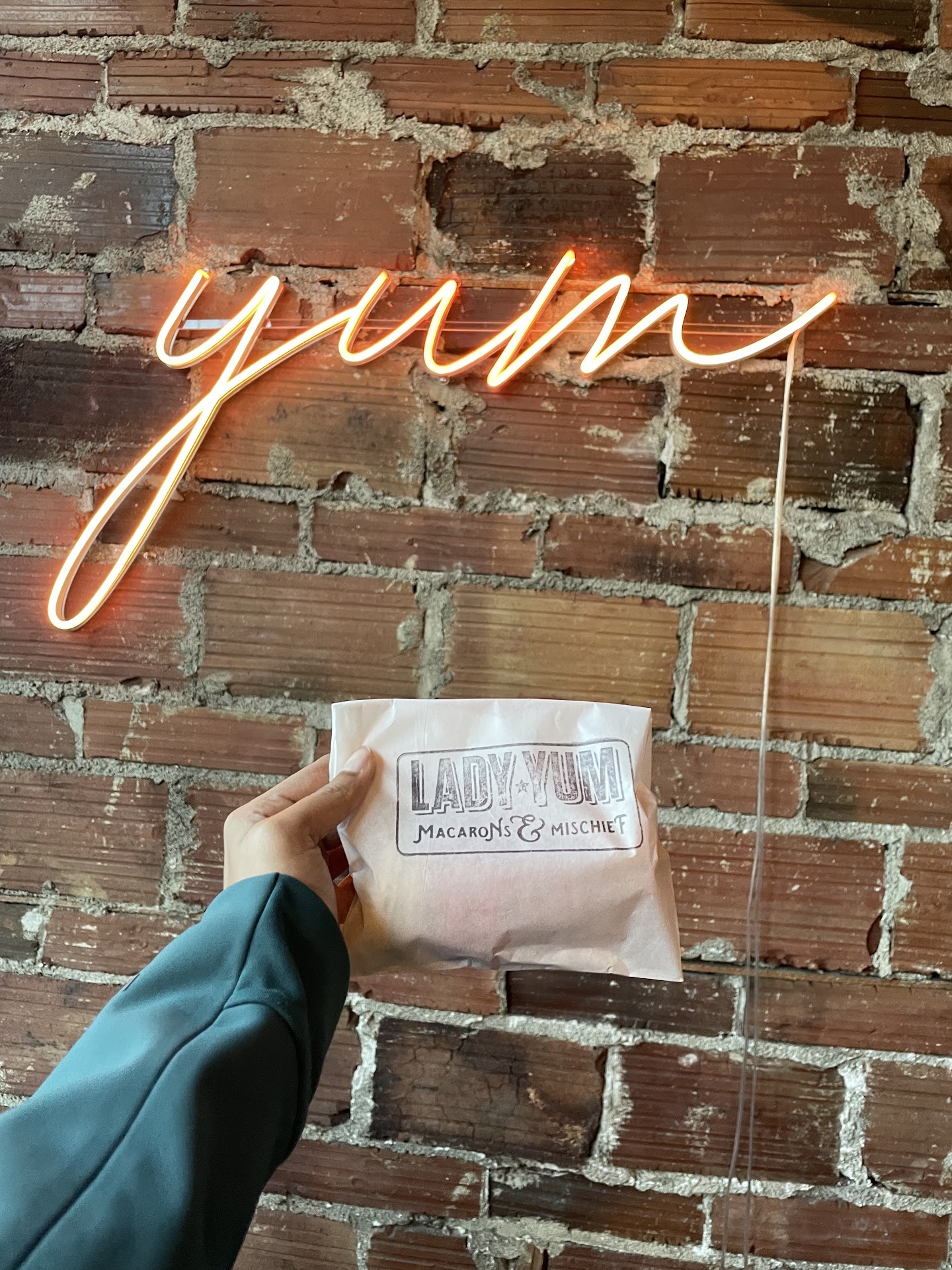 We tried a few of the signature flavors: Chocolate Mint, Toasted Coconut, Salted Caramel and Toffee Tent. We felt a little festive so we also threw in a Sugar Plum. We will be back for the Raspberry Chardonnay and Lemon. Delicious. Our favorites were the Toasted Coconut and the Chocolate Mint. The macaron was light and chewy, filling sweet, but not too sweet. Definitely worth every penny. The outside was decorated, everything was picture perfect.