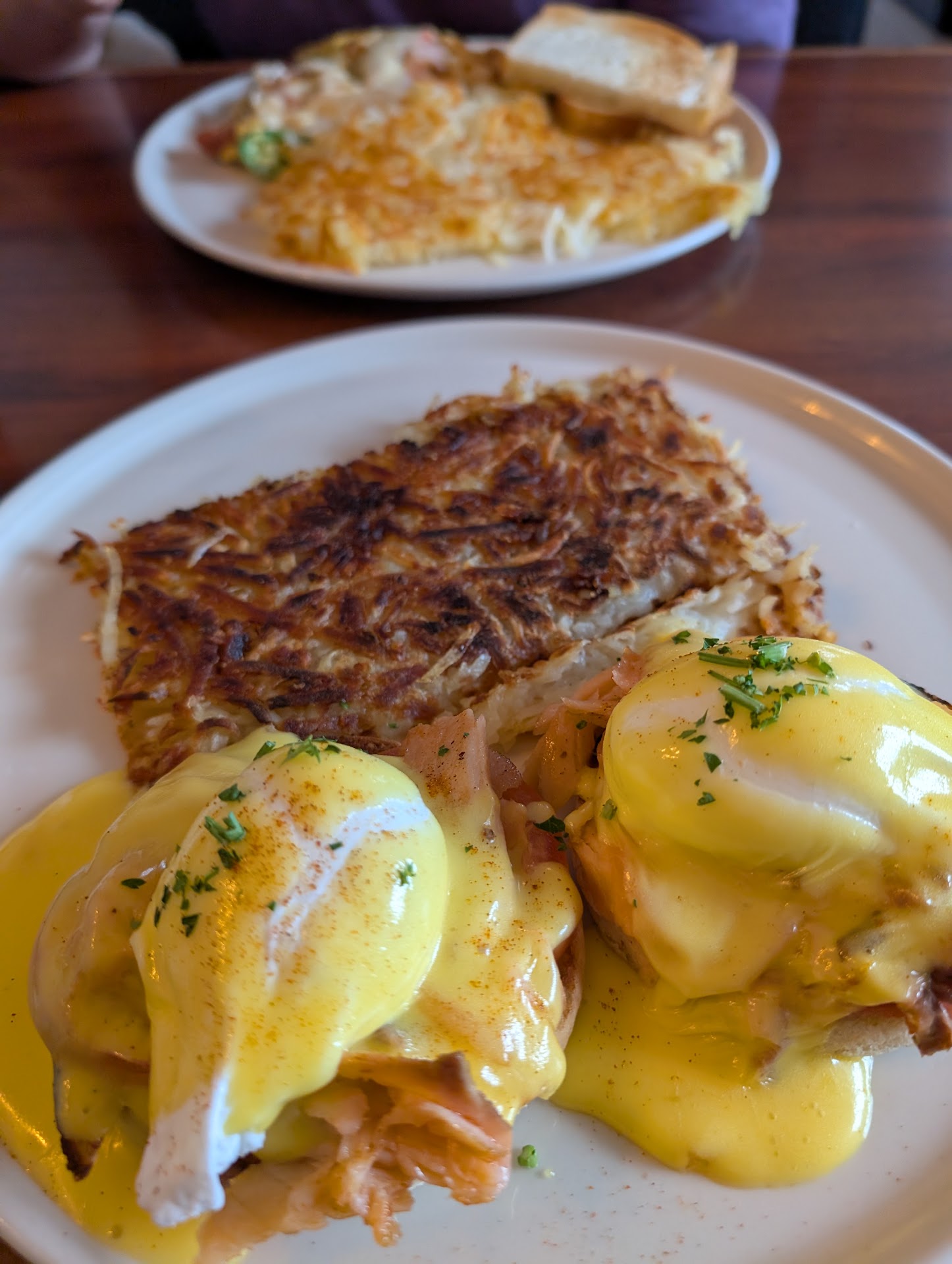 This left us with the impression that the hash browns and hollandaise sauce had been frozen, and not reheated very well.