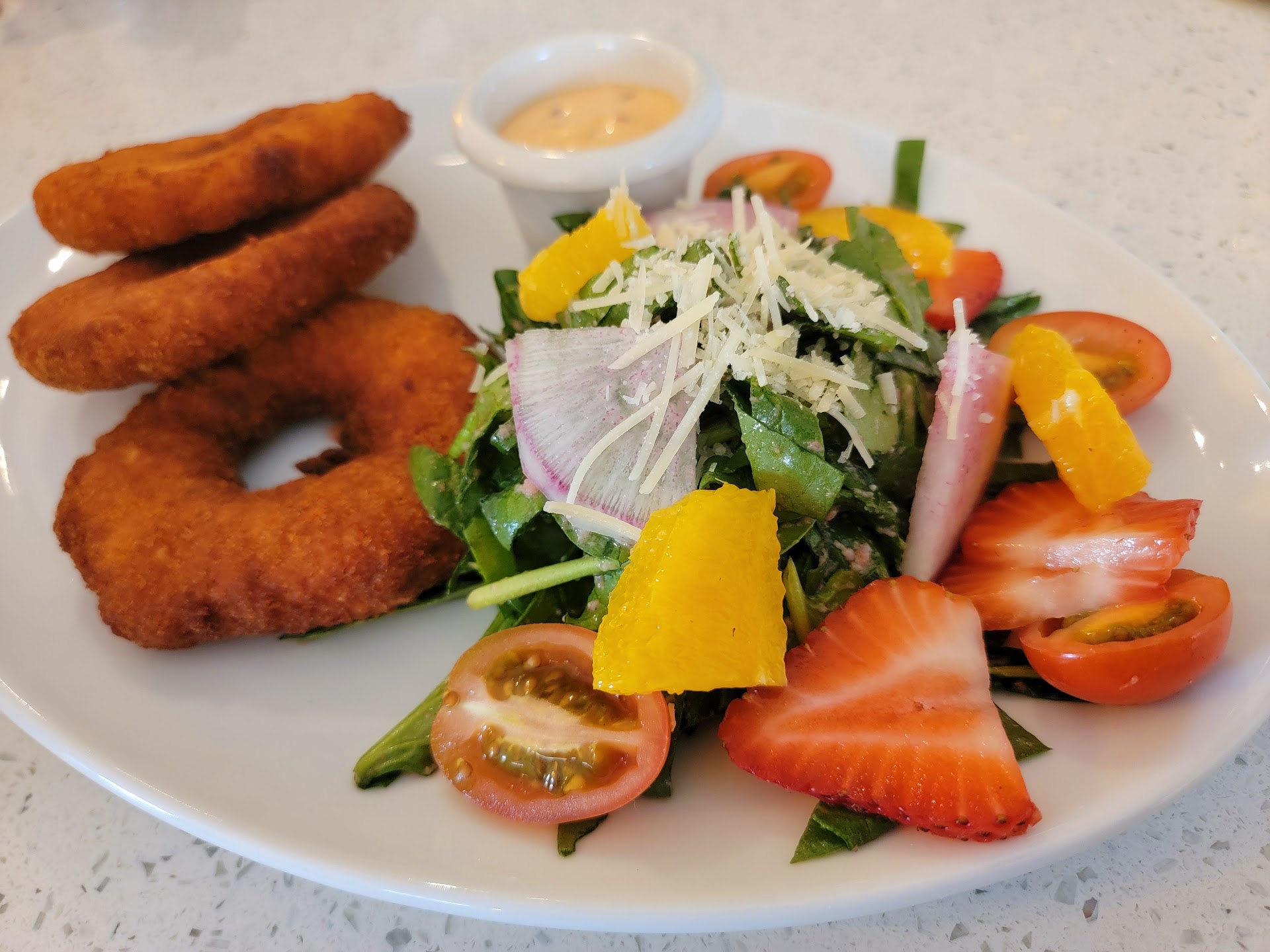 I saw something called "Chicken Doughnuts" and knew that I needed to try them. The combination of crispy, golden-battered chicken with a playful doughnut twist is nothing short of genius. Paired with a vibrant, fresh salad featuring fresh shredded lettuce, juicy strawberries, oranges, and parmesan, all dressed in a tangy strawberry vinaigrette, it was a symphony of flavors and textures. The balance was impeccable.
