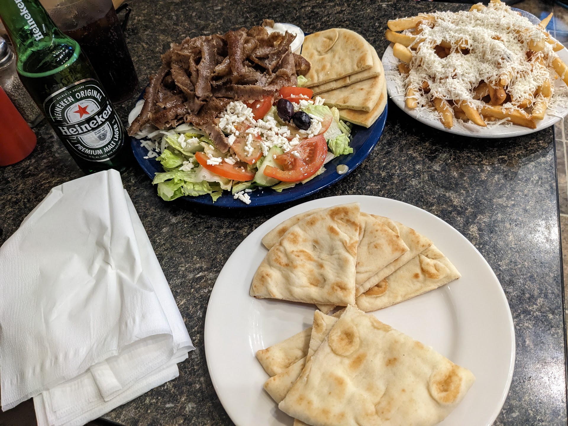 The gyro was quite good, but about on par with most other places I have eaten it. The Greek fries were okay, but honestly nothing special — basically frozen fries with some sliced cheese, which I think was feta. The falafel was fairly dry and seemed like it might have also been a frozen product, which is unfortunately par for the course at most places. The most disappointing was the spanakopita, which was soggy and dry.
