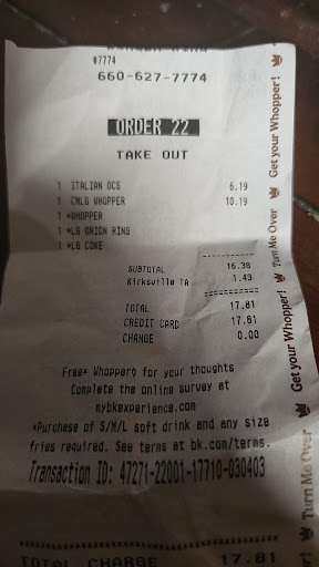 Read moreThey make my food fresh..I always grill order... And they make my bbq bacon cheese Whopper to perfection!! Kirksville Missouri Burger King Rocks!! Plus they always cut my sandwich in half. When I go in on breakfast run for my crew she's already rang me up ordered and I'm out the door in seconds... Mindy is the best during breakfast runs... And Tierra rocks dinner run!!! Will return every chance I get... I live in Tucson Arizona now... It's a true shame out here they've no clue what a bbq bacon cheese Whopper is... So very disappointing. I ordered it out here and they looked at me and asked me what that was... I was like really? Shook my head walked out and went to Taco...