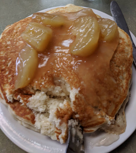 Next, the pancakes were not burnt, but getting close, and would have been dry but for the globs of chocolate chips and the butter and syrup we added.