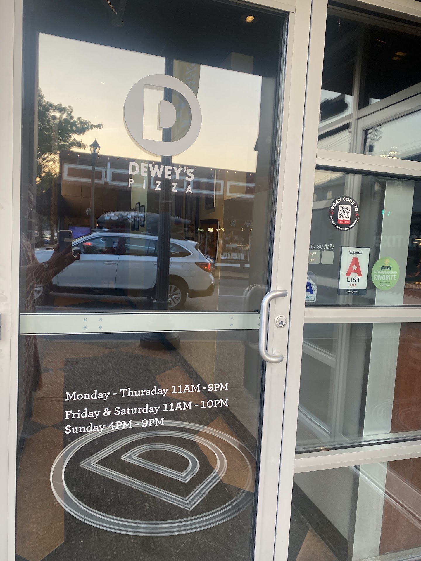 We had just visited the STL zoo with our 3 grandchildren who were all very hungry so it was decided to have pizza. We stopped by the Dewey's pizza in Kirkwood as we really enjoy Dewey's. This was our 1st visit to the location in Kirkwood and as luck would have it we arrived just before the dinner rush so our timing was perfect. We got a table immediately. We were seated, allowed time to look over the menu, and then we ordered. Our waitress informed us about their fall specials which were the Smashing pumpkin pizza and their Harvest salad. She sold my wife and I on the salad. We ordered the entree size salad as planned on splitting it between the two of us. The salad came out quickly while the pizzas were being made in the kitchen. Our 3 grandchildren were watching the pizza kitchen work on them via the see-through window they have. My wife and I were eating the salad when the waitress stopped by to check on us and I told her that the salad wasn't bad but it was missing one of the main ingredients for the salad, the toasted pumpkin seeds. She looked hard at our salad and seen for herself that they were missing. She went to the kitchen and got a small garnish cup of seeds and returned to our table with an apology. But by the time this happened we were practically done eating the salad altogether. The manager whom actually brought the salad to our table failed to recognize that an ingredient was missing. Needless to say, we still enjoyed it and then the pizzas came out. They were wonderful and we all enjoyed those.