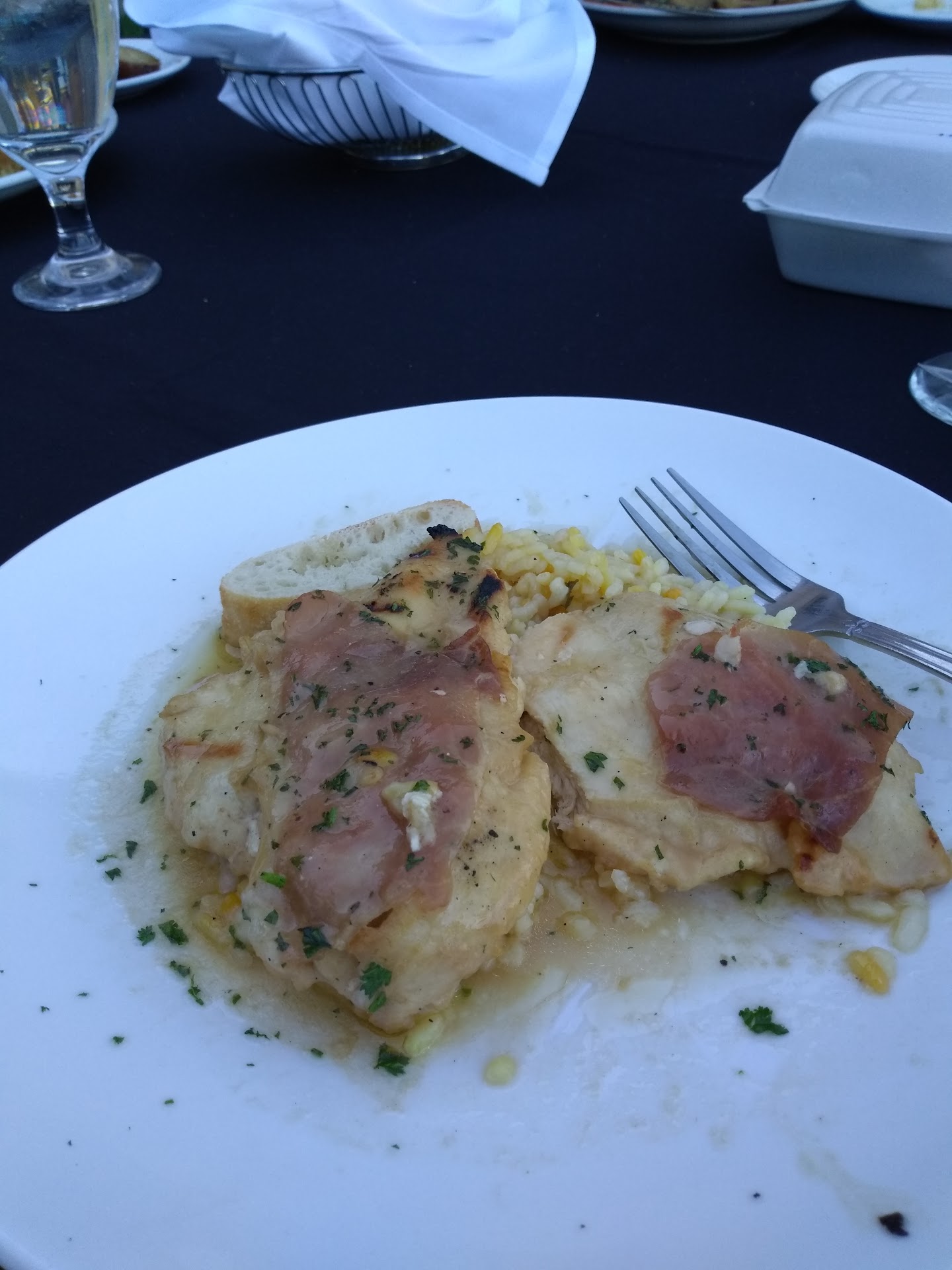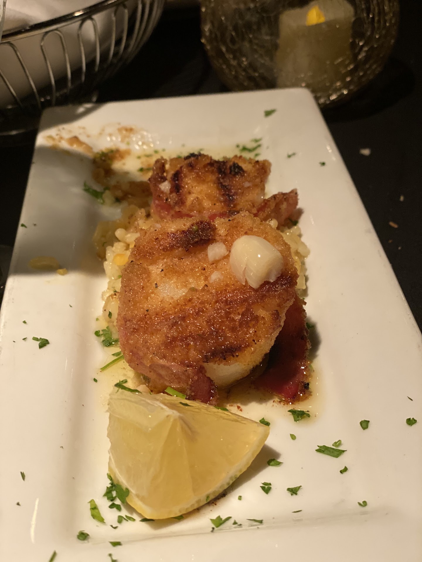 Another dinner companion had the same dish and also shared it with her husband, who both raved about all of it. My garlic lemon chicken with prosciutto (skipped the cheese) on arborio rice was excellent, but a little heavy on the salt. The waiter said he'd bring me those veggies, but did not...? Our other companion had one of the night's specials, jumbo scallops on arborio rice, which he adored, but, also, no veggies. Seemed odd... For antipasti, we shared the house meatballs and baked eggplant dishes, both fabulous.