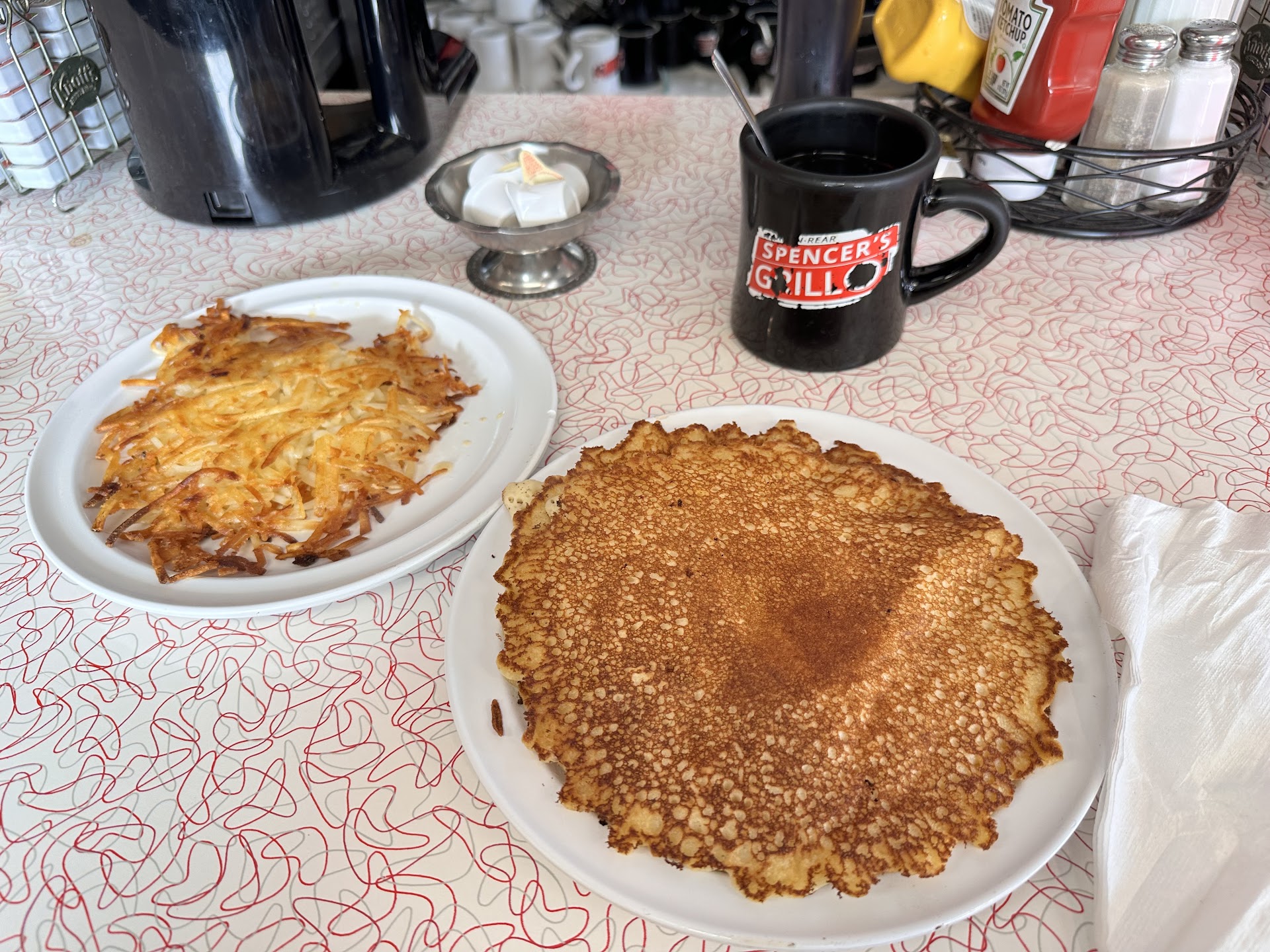 Overall, with excellent service and promising new leadership, I have high hopes for the future of Spencer’s Grill. I just hope that they thin out that pancake batter and get it back to what it looks like in my original picture below.