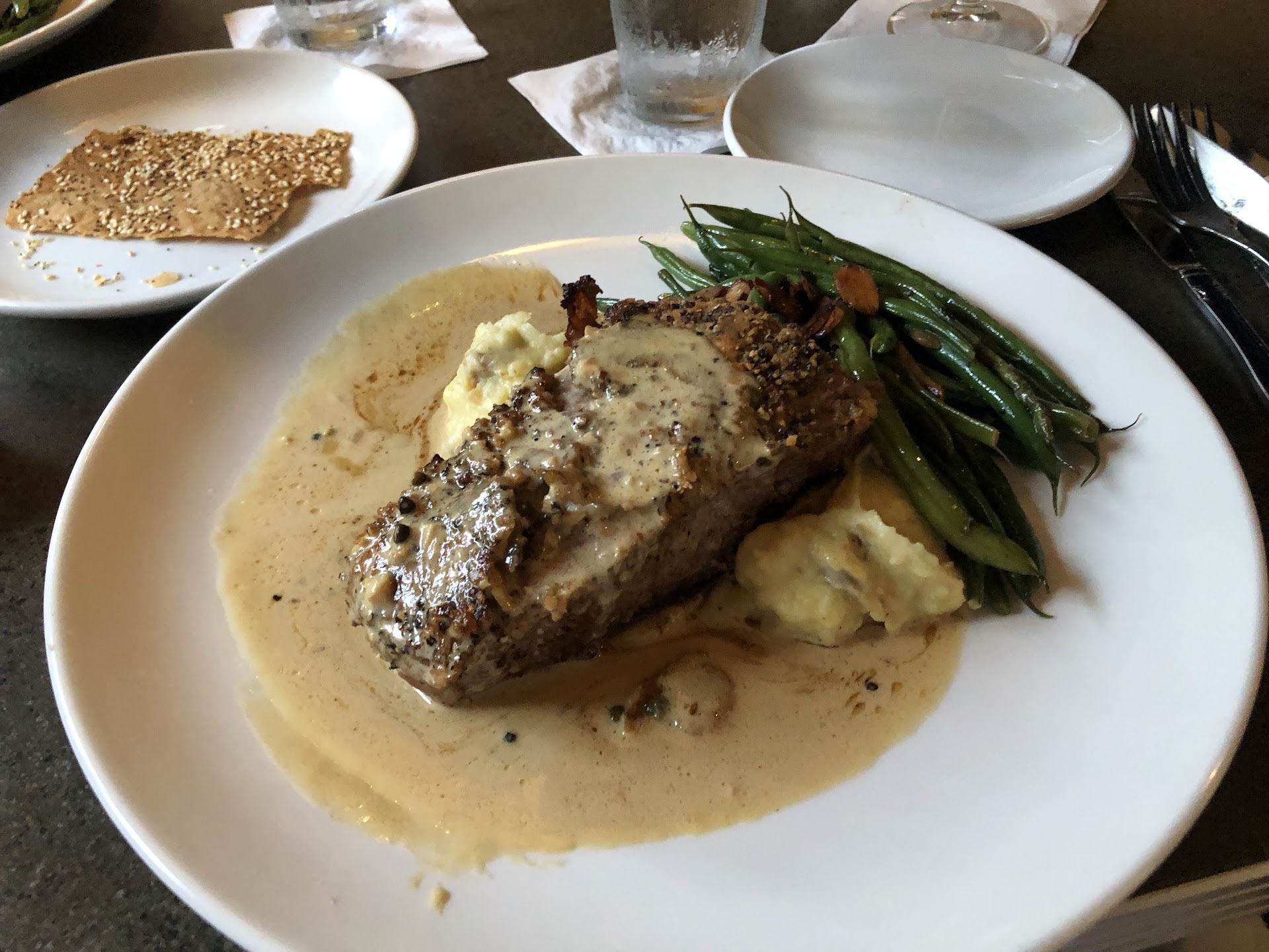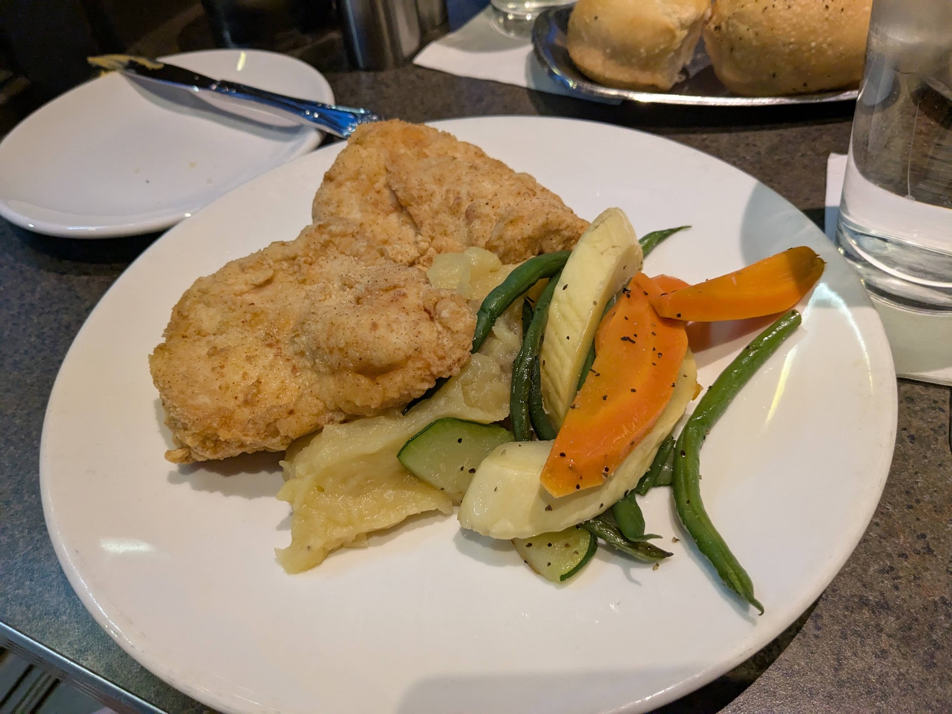 Note - you may want to make a reservation....we got there at 5 pm and got a seat, but later on the restaurant filled up. Even when it filled up, it was easy to talk and hear each other. xxxxxxxxxxxxxxxxxxxxxxxxxxxxxxxxxxxxxxxxxxxxxxxxxxxx First Visit My wife had the Pilot House Chicken and I had the Pistachio Chicken. Both were delicious, but I particularly liked the Pistachio Chicken with the grilled mushrooms and sauce. Angeline, our server, was particularly delightful and you should try and get her if possible. They do extras which other places don't do. They serve you home made crackers and cheese spread, rolls, cookies at the end of the meal and a complimentary dessert for our anniversary. I also liked that it was quiet and easy to have a conversation. I also like the parking lot so it makes it easy to get into and you don't need to park...