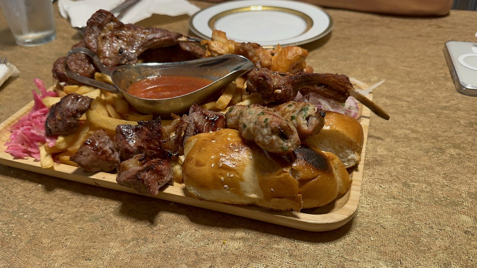 The highlight of our meal was undoubtedly the mixed kebab grill platter. This generous offering included a delectable array of chicken, lamb chops, steak, and lamb, each piece grilled to smoky perfection. Accompanied by freshly baked bread, crispy fries, and tangy onions, this platter was a testament to the chefâs mastery in blending spices and flavors.
