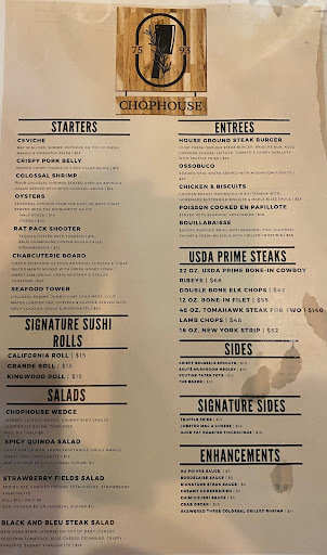 Read moreOur dining experience at 7953 Chophouse was absolutely outstanding. We started with the beef tartare, onion soup, and Caesar salad. The tartare initially came out a bit too salty, but the staff was incredibly attentive and quickly adjusted it to perfection. The onion soup was rich and flavorful, and the Caesar salad was fresh with a delightful dressing.For our entrées, we opted for the New York strip, venison chops, and the 45-day dry-aged steak. Each dish was cooked to perfection and bursting with flavor. The New York strip was juicy and tender, the venison chops were uniquely delicious with a perfect balance of gaminess, and the dry-aged steak was a true highlight, with a rich and complex flavor profile.Our drinks were equally impressive. I had the St. Augustine mule, which was refreshing and perfectly balanced, and the smoked peach old fashioned, which had a wonderful depth of flavor and a subtle smokiness that paired wonderfully with the sweetness of the peach.The ambiance of the restaurant is sophisticated and cozy, making it an ideal spot for a special evening out. The staff was friendly, professional, and very knowledgeable about the menu. Overall, 7953 Chophouse delivered a fantastic dining experience from start to finish. We will definitely be returning to savor more of their exquisite dishes. Highly...