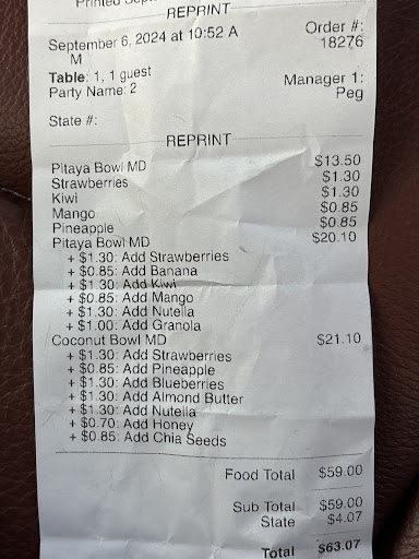 Read moreMe and 2 of my friends went to get acai bowls. We each got a medium, and made our own bowls. Peg (the worker) did not inform us that EACH ADD ON TO THE BOWL would be an extra cost…. I thought açaí bowls already came with granola and fruit??? On the screen the pre-made bowls ranged from $12-$18 based off sizing. Our total came to $59 dollars, not including tax. 1st she didn’t tell us about pricing, 2nd she added on things that we didn’t even get on our bowl, 3rd she took forever to make the bowls, 4th she was rude when we asked about pricing and to get the receipt after we saw the price, 5th she was not willing to compromise at all, and said there is nothing she could do about it. I highly do not recommend this place!!!!! I never make reviews but Peg really pushed my buttons. We also left a $10 tip and she...
