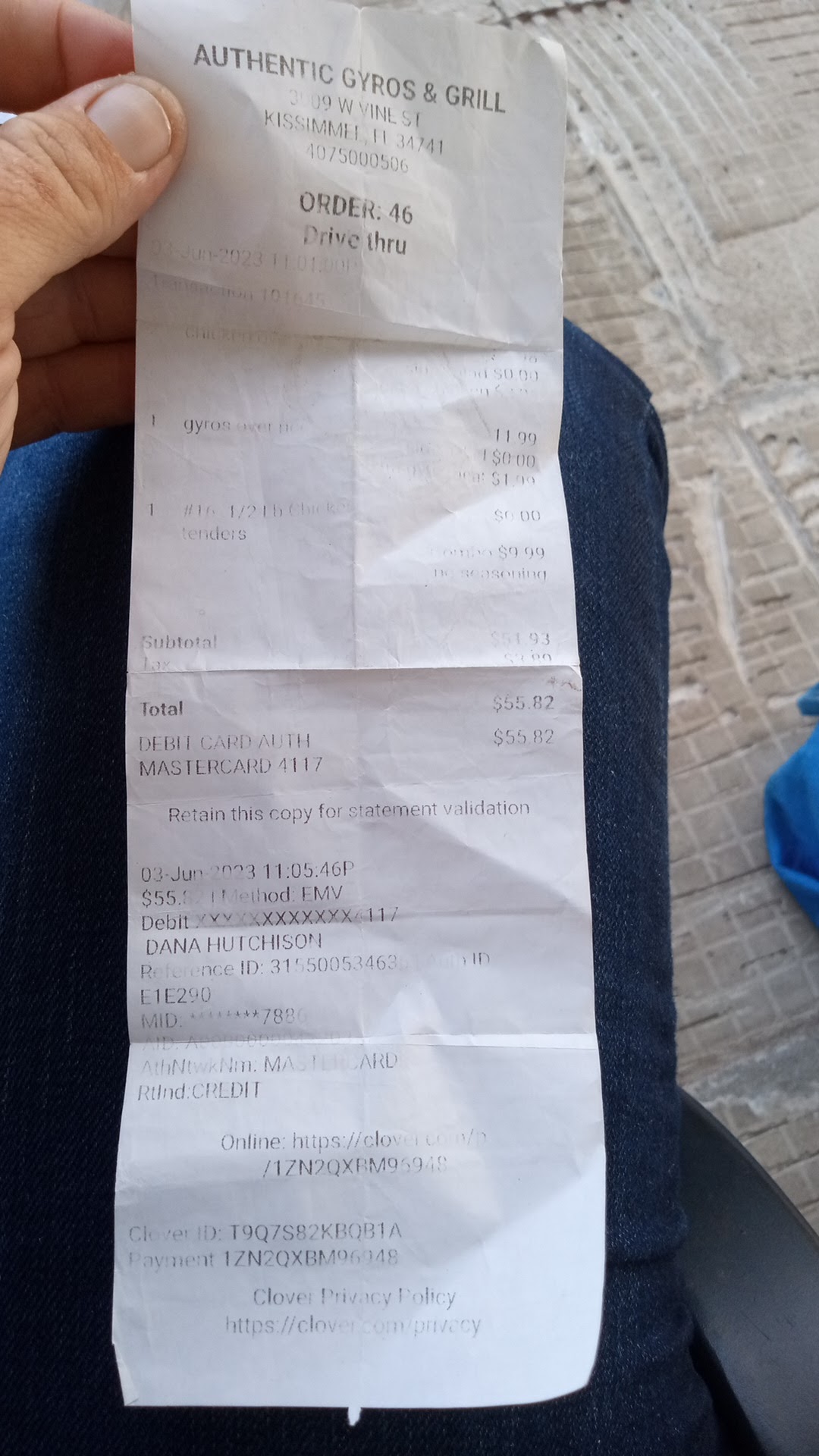 Read moreFirst off I'm only putting 1 star just to comment how bad the customer service is here for a new store they should be ashamed of themselves, i spent $55.82 on meals that came with no meat as i was traveling through florida kissimmee to be exact and I stop at my regular rest stop around midnight to eat my "Delicious greek food" that's when I noticed I had no gyro meat in not just 1 dinner tray but all missing chicken and gyro meat but was nice enough to still put the salad and rice! I immediately called to speak to a manager that next day and I spoke with a younger gentleman who was nice sounding and I explained to him what happened and $55.82 is not something to just brush off especially when I did not get what I paid for, he proceeded to apologize and said bring the receipt and they will compensate me for the trouble, I did just that when coming back through Kissimmee Florida 2 weeks later and the gentleman at the window was a different person that I spoke to on the phone he was pretty much insinuating I was lying so he called the manager and pretty much long story short I was screwed out my money and food ! I don't recommend this $* hole of a place to anyone,I will not be letting this go I am reporting to every appropriate agency including the BBB, go to a real Greek restaurant that you can watch what they make you and...