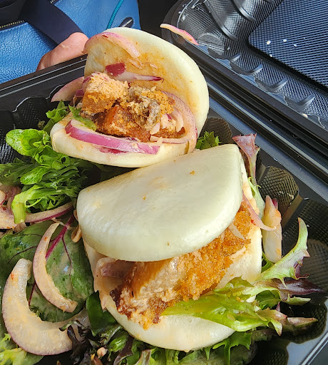 So what we ended up getting was their appetizer Bao and a single sushi roll which came out to about $31 before gratuity. The truth is you can get so much more for your money in other fusion places. This was a takeout order, when we got to our car which was just 20 ft away, we opened it, and where shocked of how poorly it was packaged. For the sake of the pictures we had to reorganize the food a little bit. I'd like to take note that we ate this in the parking lot so it's not like it traveled and got disheveled on the ride.