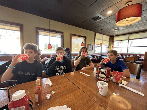 Finally got seated, figured out what we wanted and waited another 10 mins just to put in a drink order, then another 5 to put in our food (may have been more but we flagged someone down)..... Waited probably almost an hour to get the food and when it arrived, not everything was there. Waited almost 10 more minutes just to be able to flag someone down about the rest of the food (pancakes and toast) and to get a refill on the drinks.