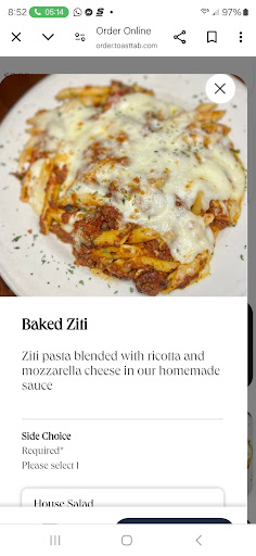 See pics below... The first picture is a screenshot of what I ordered from their Lake Nona online menu. This is what I thought I would be getting - the Baked Ziti, shown with meat clearly visible in the "homemade" sauce. The next photo shows what I received instead - a dry, meatless, unappetizing pasta with a big glob of partially melted cheese on top - very insulting for $20.