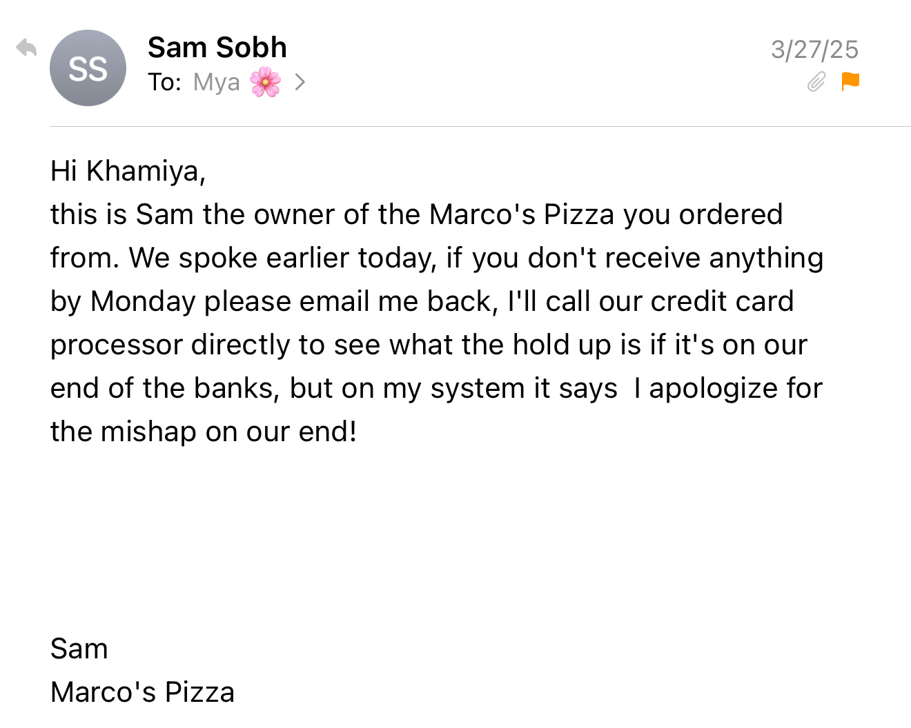 We ordered from Marco’s Pizza on April 16, 2025, at 5:26 PM. Shortly after, we began receiving DoorDash notifications—even though we didn’t place our order through DoorDash. A man (not in uniform, no thermal bag, phone on speaker) delivered the food, and the pizza arrived cold.