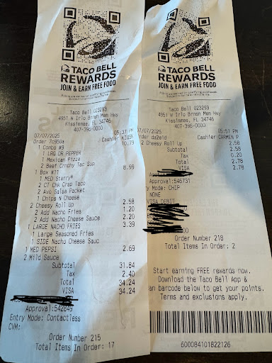 Read moreMy husband and I stopped in after grocery shopping for a quick breakfast. Staff was not present in the store and eventually 2 staff members came from the back to start working on orders. After waiting about 15 minutes, we were given our order without our drinks. It took several minutes for my husband to get anyone's attention to get our drinks. After we sat down and started to eat, I bit into my breakfast crunchwrap. We had ordered one without bacon or creamy jalapeño sauce because I am a vegetarian and didn't feel like the jalapeño sauce today. I bit into my crunchwrap which was completely filled with bacon. My husband spoke to someone at the counter about it and we sat down eating our other food waiting on my remade crunchwrap. We were never notified it was done, so he went back up to the counter and staff argued with him stating we did not click "no bacon" on the kiosk (we did) and eventually after some back and forth they made a new one. Additionally, another man came in directly after us and also ordered a crunchwrap with no meat and was given a ton of bacon, which he stated was against his religion to eat and it took some back and forth before he was given a new one as well. It does not appear that staff here are reading the tickets properly and instead become combative when approached about incorrect food orders. I would not recommend stopping at this location. There are other locations throughout Kissimmee that have better customer service and follow...