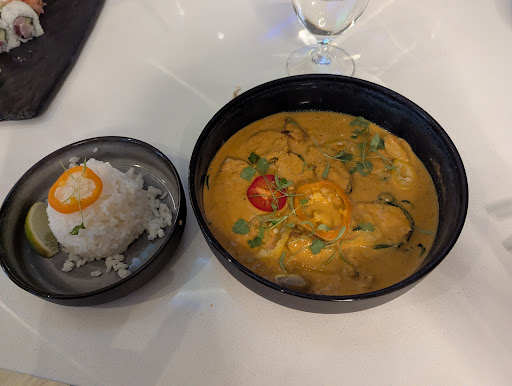 The smaller menu doesn't offer much variety, especially on the sushi, but what it lacks in options it makes up for in taste. We started with the crudo for an appetizer and the flavor was everything we hoped it would be and more. As every crudo I've ever ordered, yes, it is a small plate (shouldn't all appetizers be, anyway?) and thus crudos tend to always be pricey considering volume , but that's standard and tbh the crudo dish at Zeta came with twice as many pieces as many restaurants I've been to, yay! So between the flavor, freshness, presentation, amount, and quality, we were very pleased all around. Seriously, get it. I also got the miso soup which was ideal if you like miso soup; they did not skimp out on the little tofu pieces and seaweed :-). For my entree I ordered the red chicken curry (pictured) which came with rice. It was a fair portion, not too big, not too small. The chicken is breast and it is grilled then sliced for the perfect ratio of meat to curry. The grilled flavor underneath the sauce made it an amazing combination, whoa! My partner got the tuna poke and I tried some; it deliciously carried a wonderful variety of flavors and texture and temperatures. I especially loved the enoki mushrooms in it. The bowl looked quite satisfying so it's absolutely worth your buck. And of course... The beloved Sapporo beer. Served perfectly cold and refreshingly crisp.