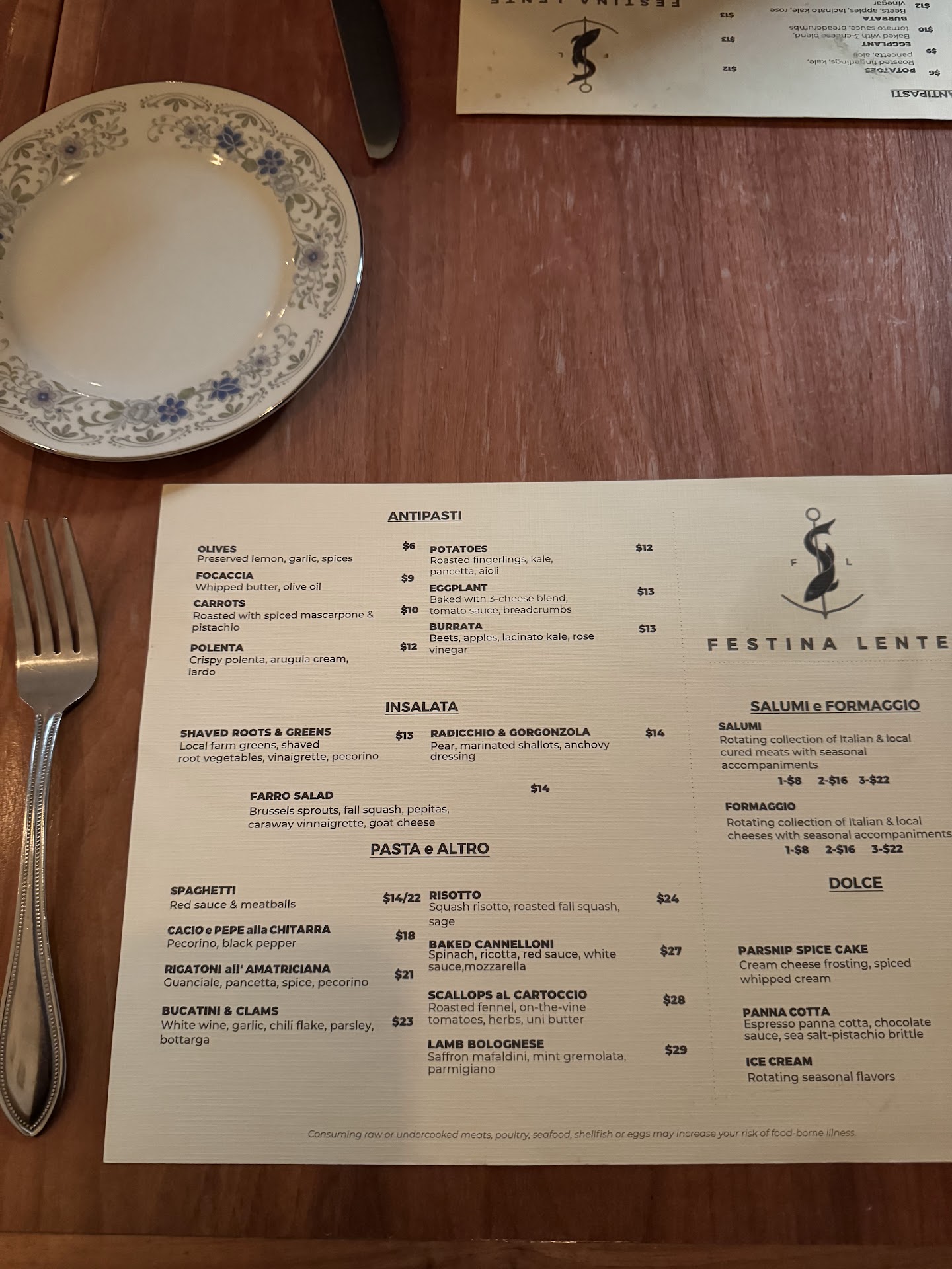 Ā Ā Ā Read moreI'm a former Dover, NH resident and Festina Lente was my go-to restaurant when I lived there. I started going there about a week after they opened after watching the renovate the space in the weeks before they opened. I have lived in Italy (Perugia, Umbria) for 4 years now and my impression of Festina Lente has gone from 5 stars to 100 stars since moving here. The food at Festina Lente is the most authentic Italian food I've eaten in the US. I would actually call it Umbrian or Tuscan. From the antipasto to the dolce, pure Italian. The wine is top notch and the service is always exceptional. I don't know Sam, the chef's, connection to Italy and weather he regularly visits here to taste Umbrian food, but his food is as good and as consistent as the best restaurants in Umbria. I live around real Italian food every day and I miss being able to eat at...