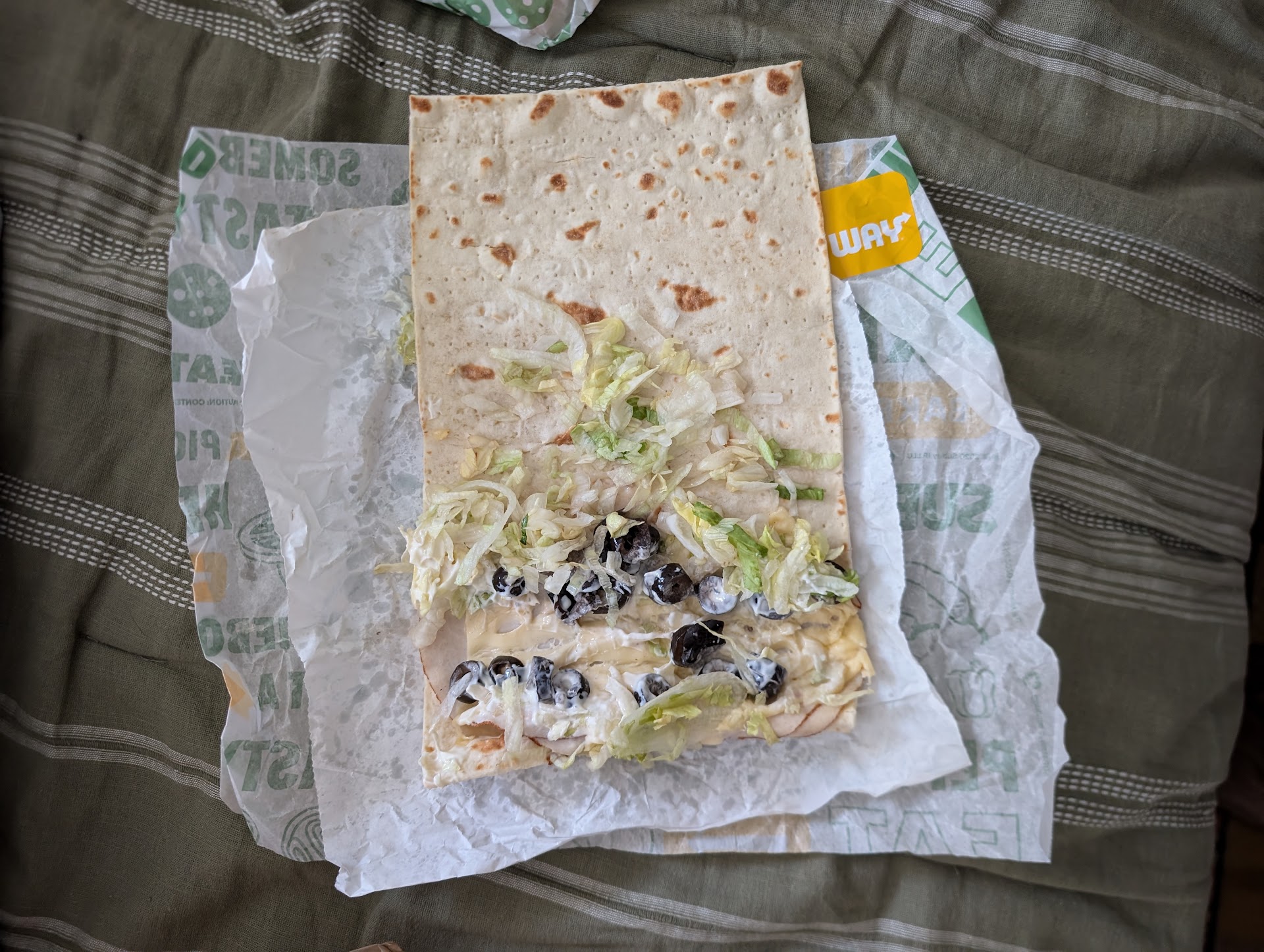 (Writing as a customer and former employee at another subway franchise) Walked in to an empty store, no employee in sight despite the door making a sound when someone enters. When someone finally appeared several minutes later they said nothing and I told them I was picking up a mobile order. I get the order for 2 footlongs and notice one in the bag looks like a six inch and I tell them. Confused, they call out to another worker in the back who assured them they both are footlongs and it's only packaged smaller because its a flatbread. I take them at their word and assume it got wrapped with both halves side-by-side. I get home and come to realize, they made my flatbread width wise and rolled the extra bread up like a burrito? Which conveniently provided me with a footlongs worth of bread and a 6 inch worth of toppings. Go figure. I do not recommend going here if that's the kind of service they are putting out while simultaneously getting scammed for what you paid for. Pictures...