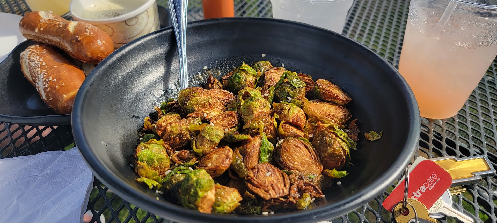Our server Dave took great care of us and walked us through his favorites being his first time here. He suggested the Brussels sprouts and fig & soppressata pizza and we got both. The Brussels came with a ginger/sesame sauce that was absolutely incredible. Dave made sure to tell us to toss the Brussels in the sauce that was at the bottom of the bowl and we ate every bite! Sauce was out of this world and they even sell it in bottles to take home.