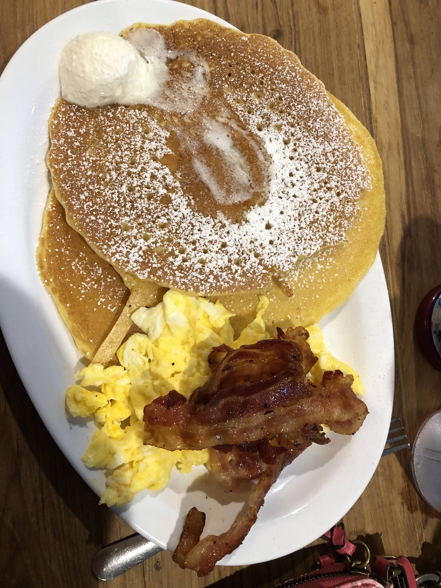 My little guy got chocolate chip pancakes and bacon. This one is hard to please. He was full quickly (a sign of quality food) and was protecting his leftovers like he found a treasure chest.