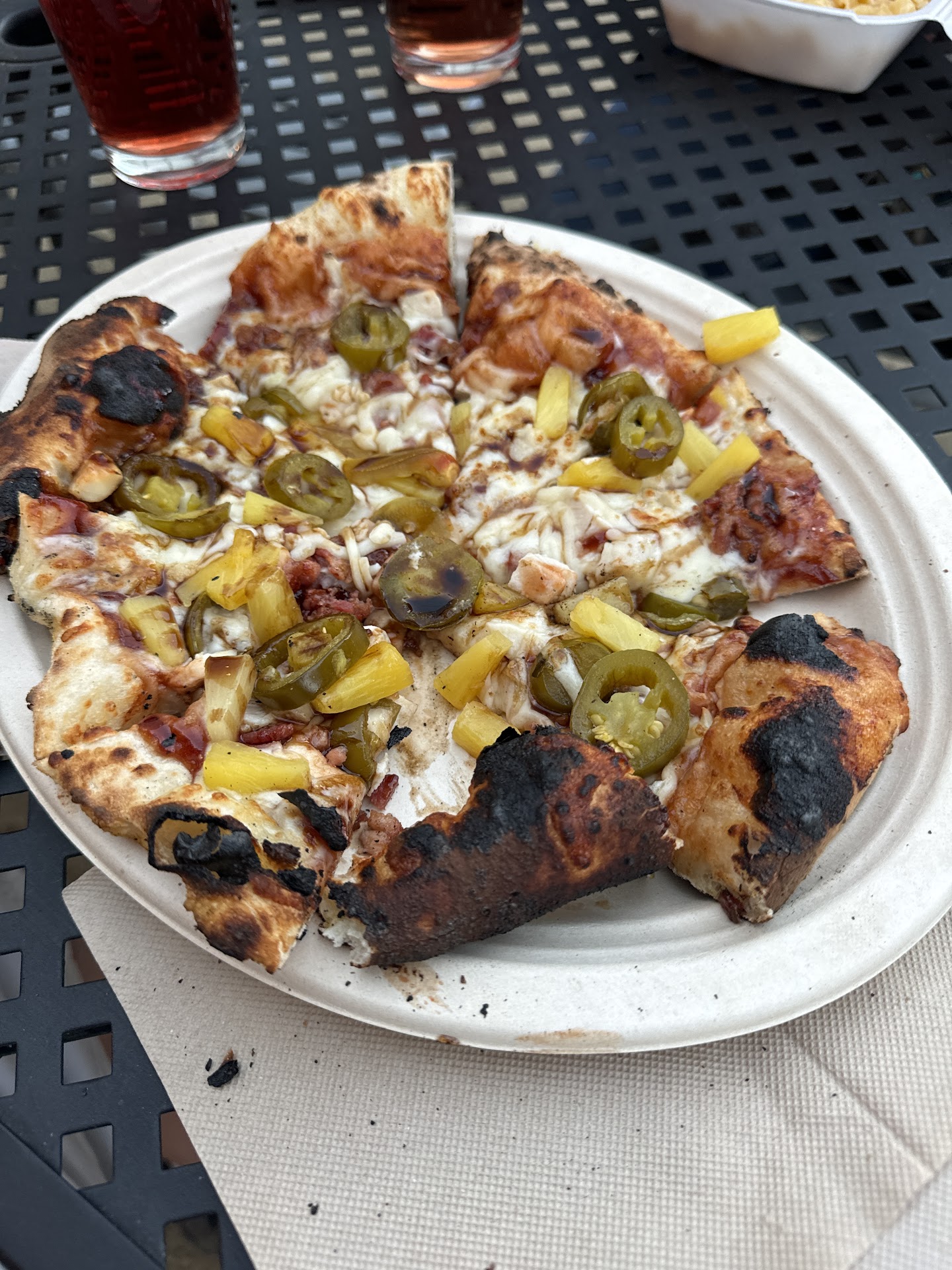This pizza is ridiculously good. I’m in town from Salem for work and am always looking for new food to try. This pizza is better than any places back home in Salem. I got a cheese and a bacon chicken ranch. Usually I don’t like bacon chicken ranch because I just think ranch as the sauce can get weird, this one however is the best I’ve ever had. The cheese is also really good, perfect simple cheese pizza. I highly recommend getting the balsamic drizzle on both. The crust on this pizza is perfect as well! I really can’t say anything bad at all. Great atmosphere at the food truck pod and I wish them well. I’ll definitely come back if I’m...
