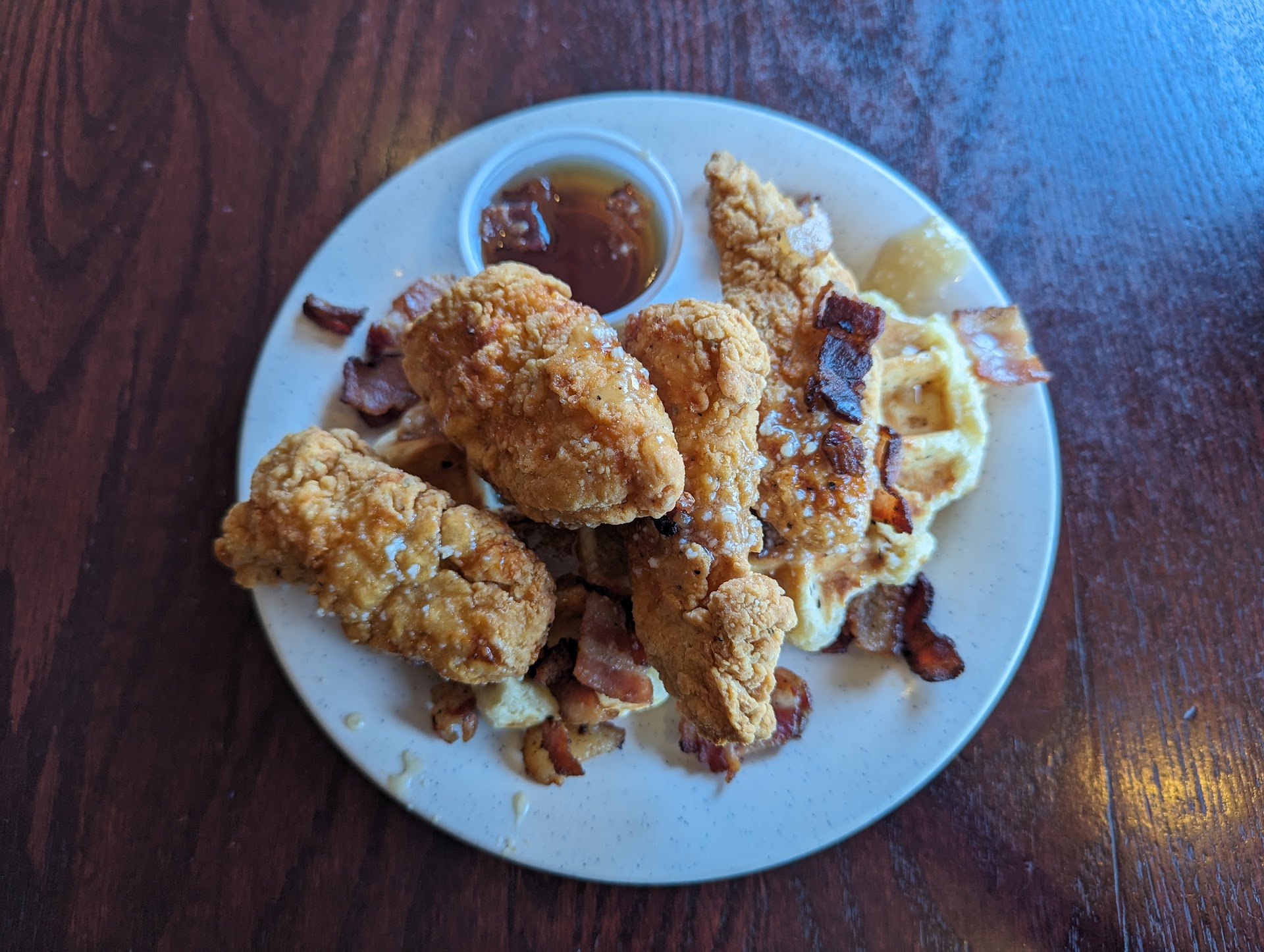 And this place is apparently known for leige waffles and their chicken? I ordered liege waffles and chicken. I have had leige waffles before and even the prepackaged one from Costco does not tastes this horrible. It tastes like I was eating partially raw/undercooked biscuit dough that was so dry, heavy and tasteless? Then the "honey" drizzle on top was didn't taste like honey it was more of a crystallized sugar thick syrup? And the chicken tender was just generic - nothing special, taste like those frozen chicken tenders you can get anywhere and make at home. The bacon bits on top was just dried, burnt, inedible.