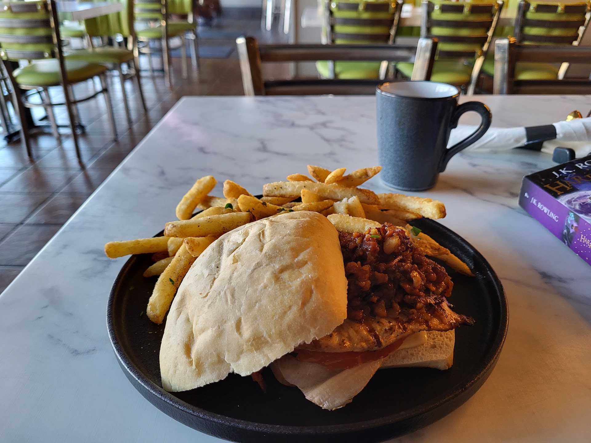 My partner ordered the fried chicken sandwich. She did not care for the seasoning and left more than half of it. The potatoes tasted good but were kind of cold. This meal was also a generous portion.