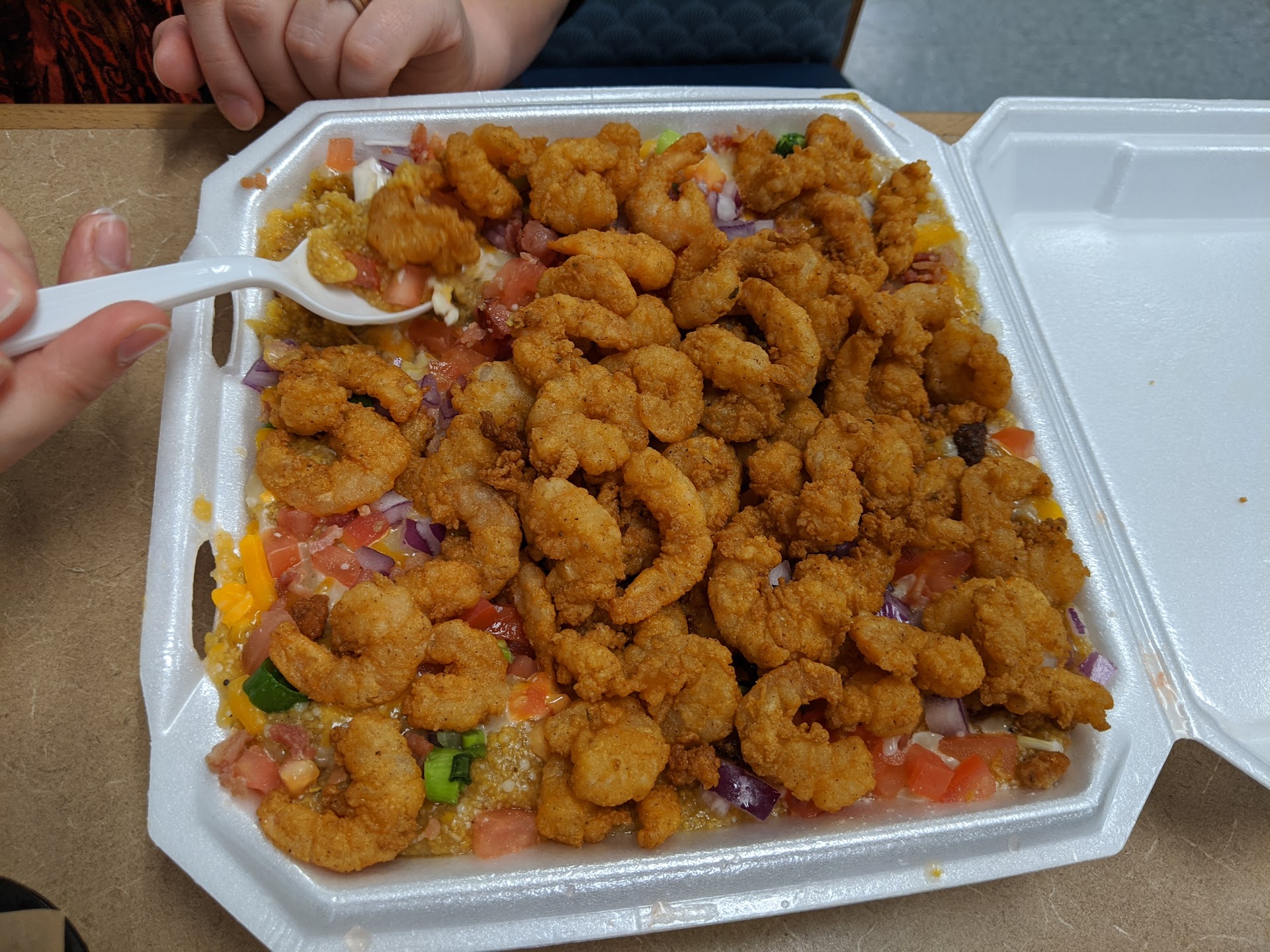 Second visit, packed our to-go order badly - steamed broccoli and butter POURED IN THE BOTTOM OF A SECTIONLESS STYROFOAM BOX, covered with A SHEET OF WAX PAPER, and biscuits, okra, and fried food layered on top of this. Of course the biscuits were dough and EVERYTHING except the top fish fillet was drenched and soggy by the time we got it home. Hole in the wax paper when we tried to lift it up.