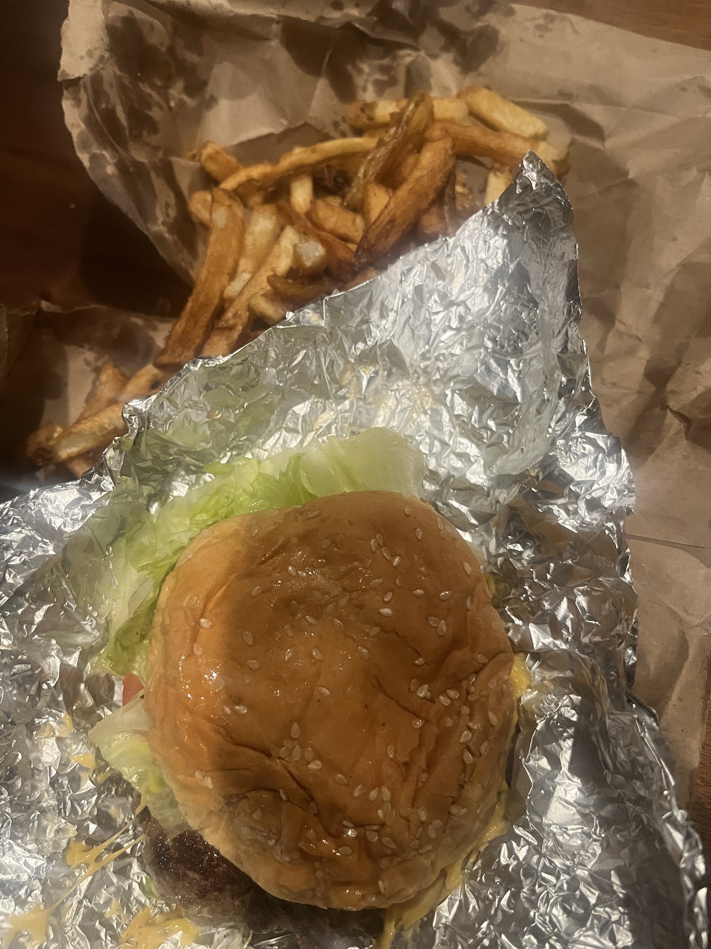 Probably wont be back to this location... I am a service manager at a restaurant, actually just got off a hard shift that I had to run, and I didn't have anything to eat. I was in the mood for a burger so my husband and I decided we wanted to try out five guys because we've heard good things about them but never been. 2 things bothered me to the point that it ruined my experience