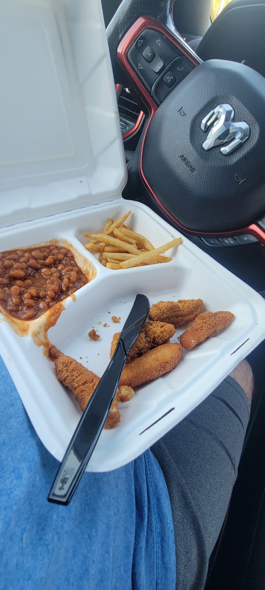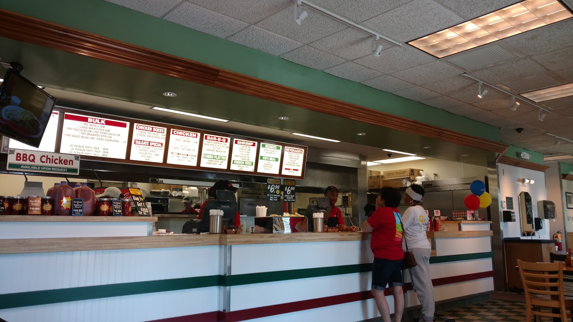 Read moreIt was interesting. We ordered and got food quickly. However when it was brought to the table it was on a tray on the tray were fries on wax paper that was put directly onto the table the chicken box is literally a box with chicken in it. We had to request forks and plates. Workers came around and refilled our drinks. It was a very generous portion of fries the Fried Chicken was good average but good however the barbecue chicken looked more like it had been boiled or broiled. The barbecue sauce put on top of it was very vinegar heavy. Making the sauce extremely tangy. When my sister complain to one of the workers she simply threw the food away and didn't tell her manager or offered to bring anything in replacement. My sister had to flag down a manager and ask him to replace her food or givd refund her he was very polite about it and quickly got her some Fried Chicken to replace the barbecue chicken. I'd recommend the Fried Chicken and fries. However the barbecue chicken and hush puppies...
