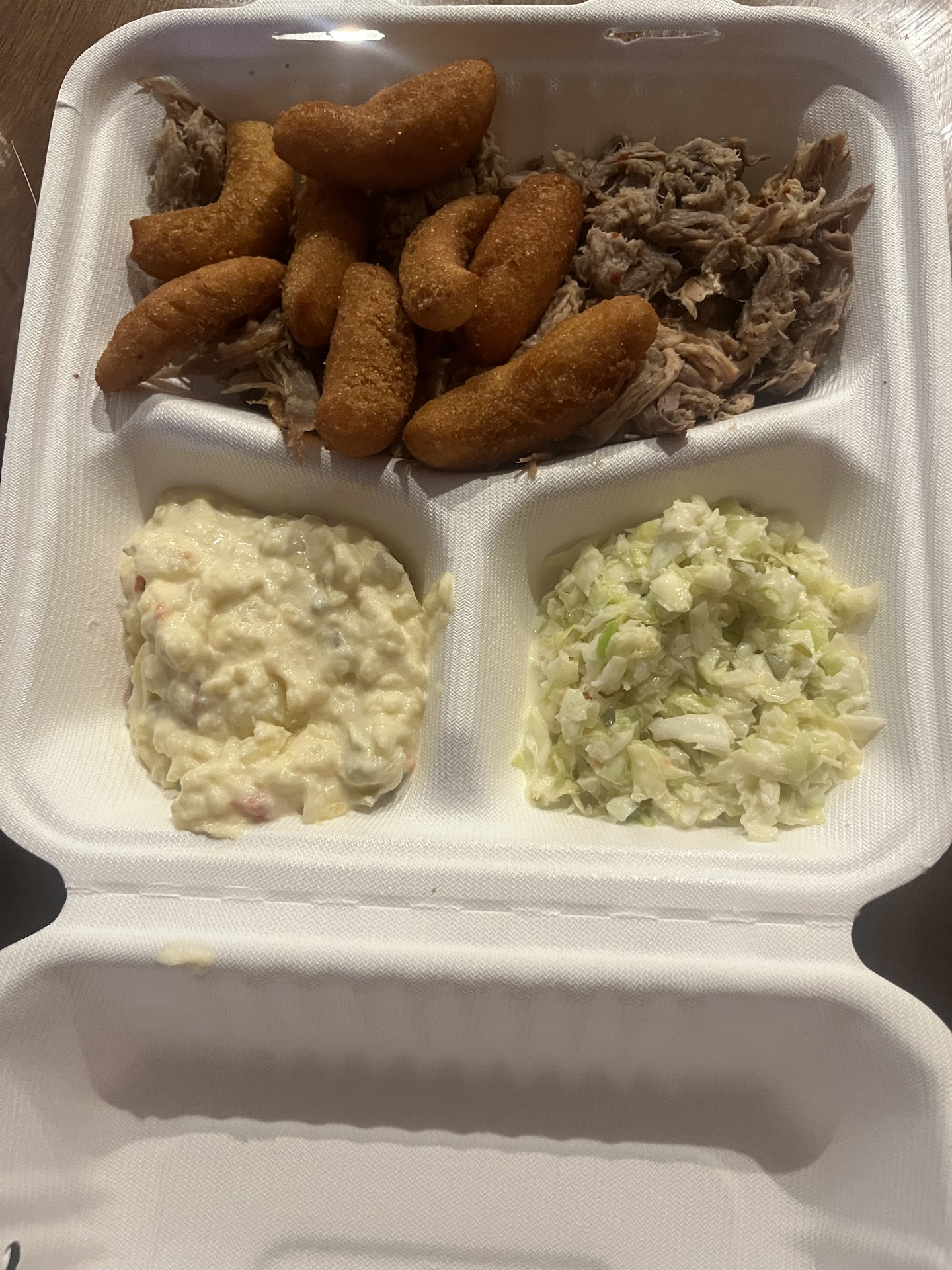 Pulled Pork Plate: 3.3/10 While the taste of the pork was acceptable, the presence of bones and cartilage necessitated caution with every bite, diminishing the overall enjoyment. The absence of BBQ sauce in the takeout bag was a notable oversight.