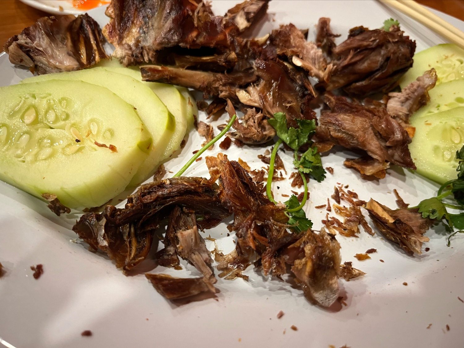 The timing - while our waitress was attentive, the roast duck came out well over 10 minutes (probably closer to 15) after my moms noodles. The waitress apologized and let me know the duck took longer to prepare. Honestly I was expecting it to only take a few extra minutes, assuming it was just being fired off since the prep for the dish would have to be done in advance. (I have eaten at restaurants that served carved Peking duck, and they timed it within minutes of my dining companion’s entree). It would have been nice if they had delayed the noodles a bit so my mom wasn’t almost finished by the time I got my meal, but not the end of the world. The bigger issue was that it appears the extra time was used to mummify the duck under a heat lamp or similar, bringing us to…