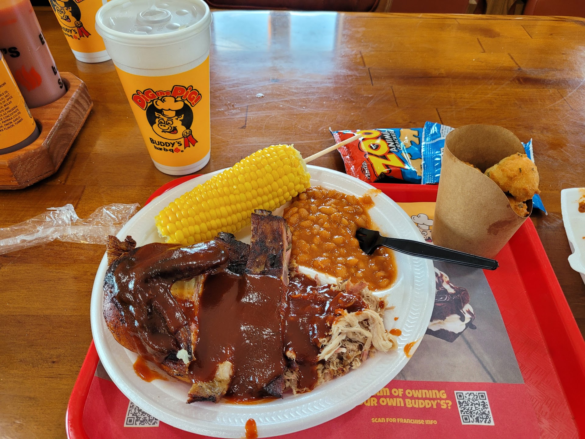 Read moreThere are few barbecue places, not to mention fast food places, that have a quality and value comparable to Buddy's. For the price of a Burger King or McDonald's value meal, you can get a MUCH better combo at Buddy's. Easily, the best thing they have is all you can eat ribs (with two sides and hushpuppies) on Saturday, but the pulled pork and pulled chicken sandwiches are fantastic too. For sides I recommend the cole slaw, potato salad and fries. The baked potatoes and smoked half chickens are also amazing. Not only do they have the dine in quick service options, but they have catering too and a banquet hall. The weirdest thing is that they have the BEST HUSHPUPPIES EVER!!! Why isn't it a random fish and chips spot?!?! IDK, but the Buddy's hushpuppies are delicious and sometimes they even come around the dining room and offer extras. In a world of cost cutting and shrinkflation, they are really delivering a value almost anyone can afford while managing to maintain a level of customer service you simply can't find at this...