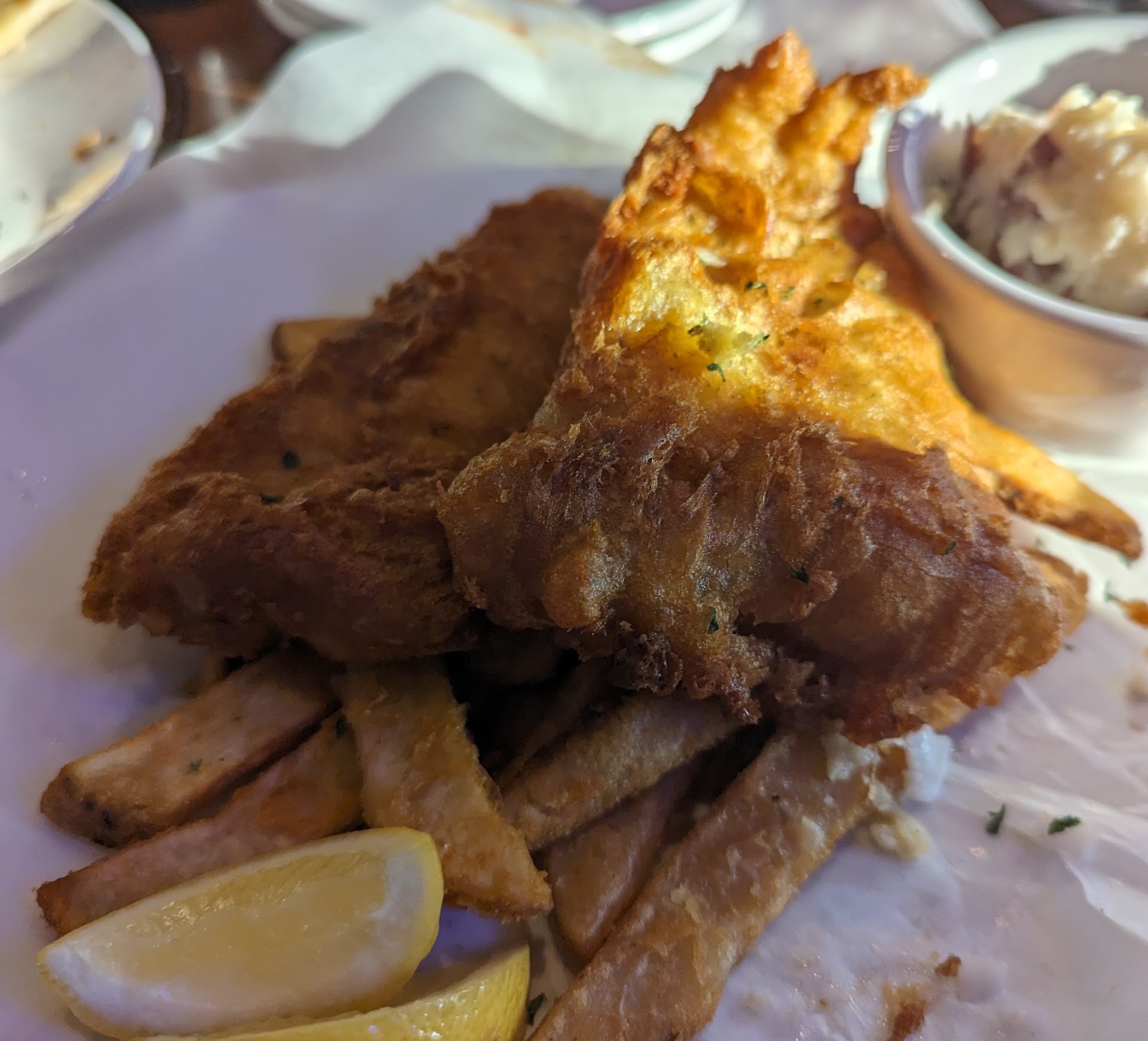 The fish and chips didn't turn out; arrived with soggy fries and overcooked fish, w no tartar sauce... but the flavor was definitely there - and having vinegar, etc. offered alongside it shows that they know how to at least serve seafood!